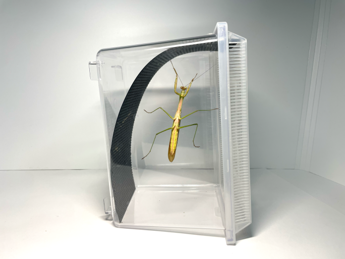 カマキリはどの種類のものも比較的簡単に飼育することができますが、いくつか押さえておきたいポイントがあります。用意するケースはカマキリのサイズによりますが、広くて風通しのよいケースを用意しましょう。メッシュ蓋のケースなどがおすすめです。