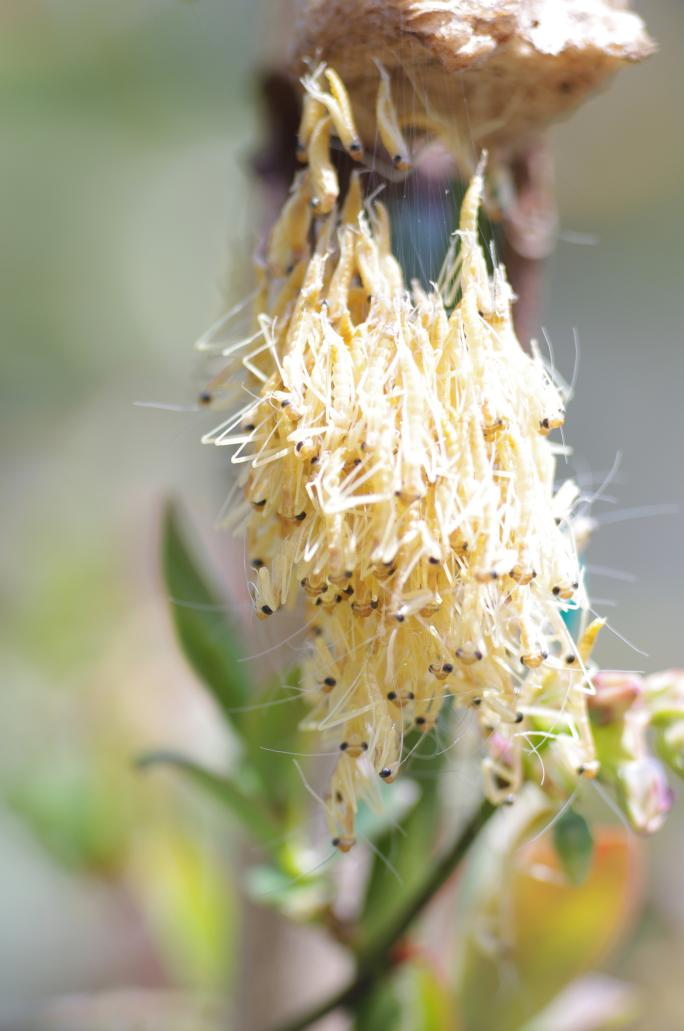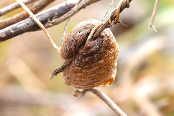 秋になると、お腹の大きなカマキリのメスを多くみかけるようになります。9月から10月に見かける彼らは、ほとんどが他のオスと交尾をして、産卵する準備ができている個体たちです。彼らを持ち帰って飼育していると、木の枝やケースの蓋に大きな泡状の塊を産みつけます。これは卵嚢(らんのう)といって、この塊の中に多い時だと200個近い卵が産み付けられています。日本のカマキリのほとんどは卵のまま冬を越し、春になると卵から一斉に幼虫が孵化してきます。しかしカマキリの幼虫の飼育はとても大変ですので、責任をもって飼育できないのであれば、産卵させることはあまりおすすめしません。