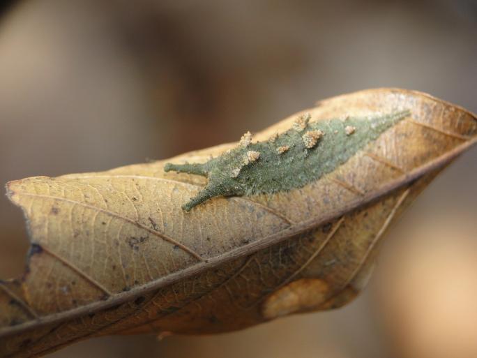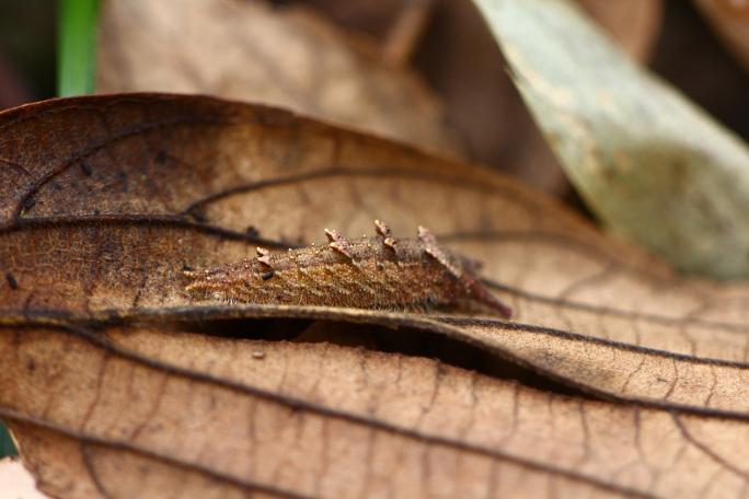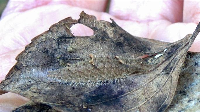 オオムラサキやゴマダラチョウの幼虫は、大きなエノキの木の葉っぱを食べます。冬になると、幼虫たちは木の根本まで降りてきて、地面の枯れ葉の裏で越冬します。彼らが生息している地域に行き、エノキの木の根本で葉っぱを捲ると、越冬している幼虫を見つけることができます。越冬している時は枯れ葉に擬態するため、緑色の体を茶色にして越冬します。
