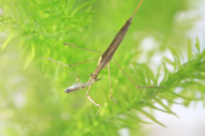 カマキリのような見た目をしていますが、カメムシ目の昆虫です。カマキリと同じく、前脚のカマを使って、マツモムシなどの小さな昆虫などを捕まえて体液を吸汁します。