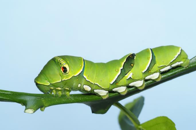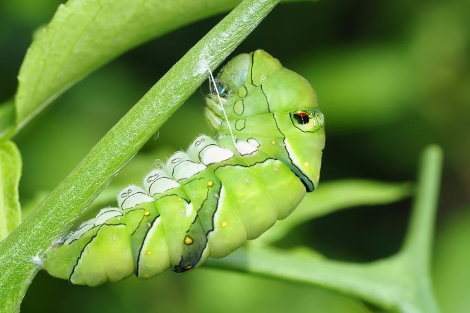 クスノキやタブノキなど、クスノキ科の植物の葉を食べるイモムシです。クスノキは神社などの近くに多く生えていることから、成虫を街中でも見かけることが多い種類です。探すコツとしては「ひこばえ」という、木の根本付近から生えている新芽を探すと簡単に見つけることができます。