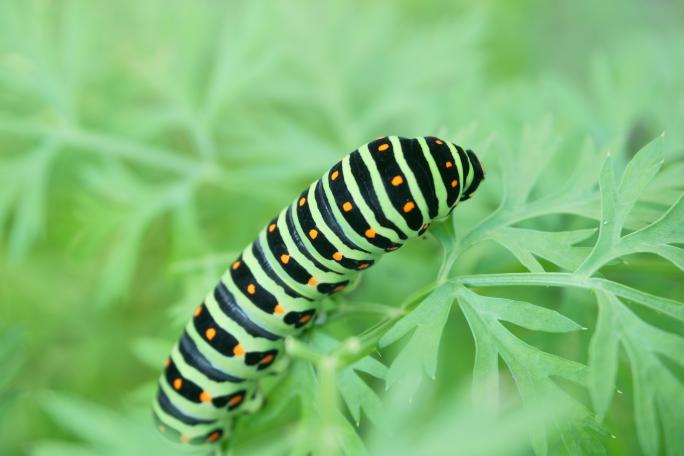 ニンジン、パセリなど、セリ科の植物の葉を食べるイモムシです。家庭菜園などをやっている人はよく見かけるイモムシかもしれません。ゼブラ柄が特徴のイモムシで、成虫はナミアゲハよりも濃い黄色をしています。
