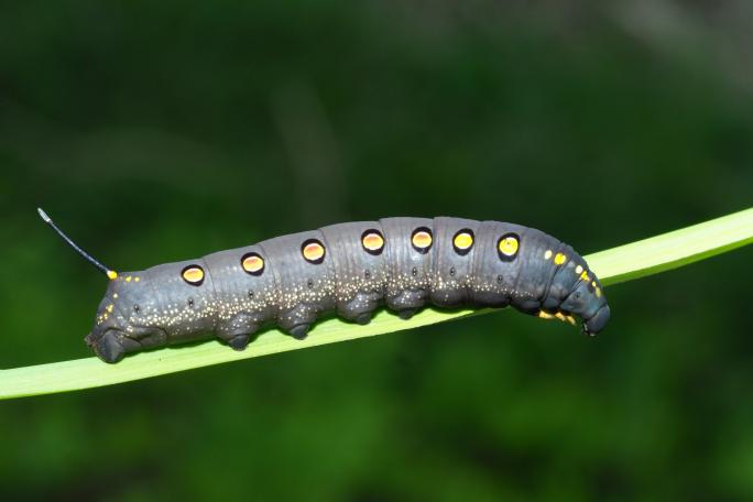 オオスカシバと同じスズメガのなかまです。ヤブガラシという植物の葉を食べるイモムシです。ヤブガラシは雑草として、人家の庭や町中に多く生えていることから、幼虫も成虫もみなさんの身近に見られることが多い種類です。