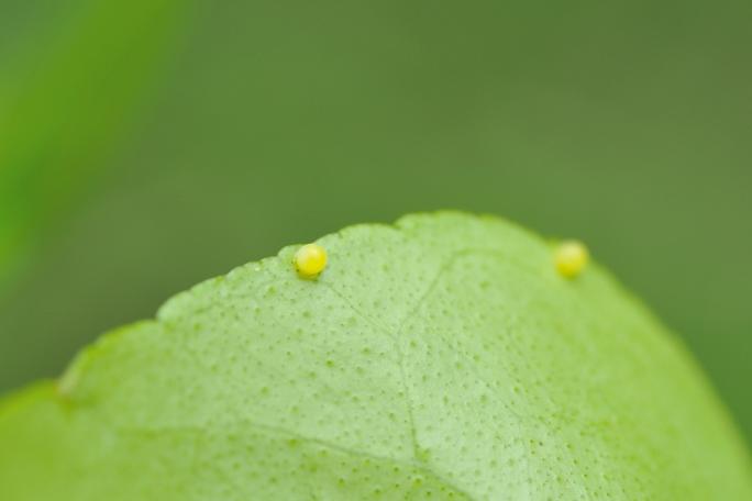 ミカン、カラタチ、レモン、サンショウなどミカン科の植物の葉を食べるイモムシです。ミカン科の植物は人の家の庭などにも多く植えられているため、幼虫も成虫も街中で見かけることが多いかと思います。幼虫は刺激を受けると、オレンジ色の臭いツノを出します。人間にとっても臭い匂いをしており、この匂いで外敵を追い払います。