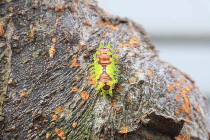イラガにはいくつか種類がいますが、身近にいる代表的なイラガやシロヘリアオイラガは蛍光色の緑色の体色をしており、毒針毛を持っています。