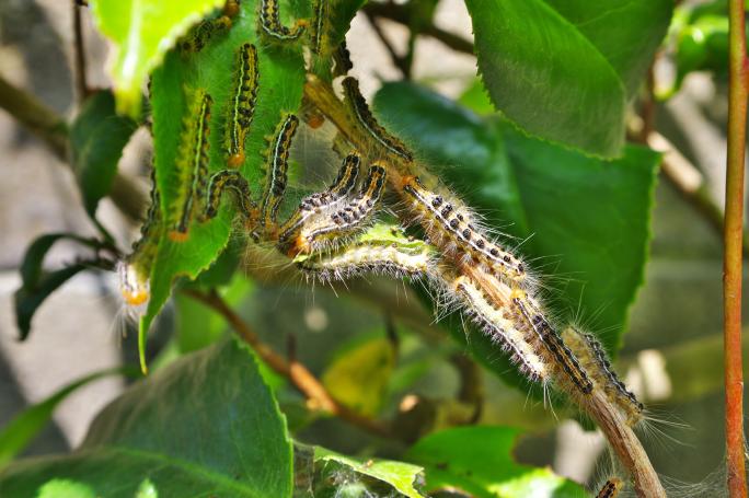 イラガに続いて、人が刺されてしまう毛虫の代表的な種類です。チャドクガという種類のガの幼虫で、春と秋に集団でツバキ類の植物状に見られます。
