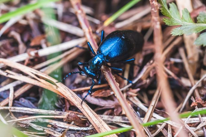 光沢のある青い体をしているコウチュウのなかまです。ハンミョウという名前がついていますが、一般的に知られているようなハンミョウのなかまではありません。