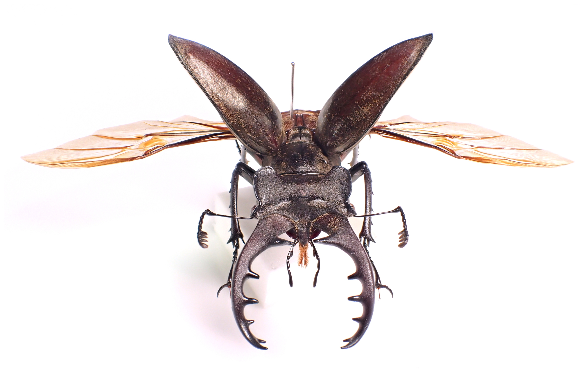 2週間〜1ヶ月経って、標本が乾燥して固まったら、最初に刺した 標本針以外の展脚用の針を抜いていきます。この時、乾燥している昆虫の脚や触角は脆くなっていることがあるので、ゆっくり慎重に抜いていきましょう。うまく針を外すことができたら標本の完成です。