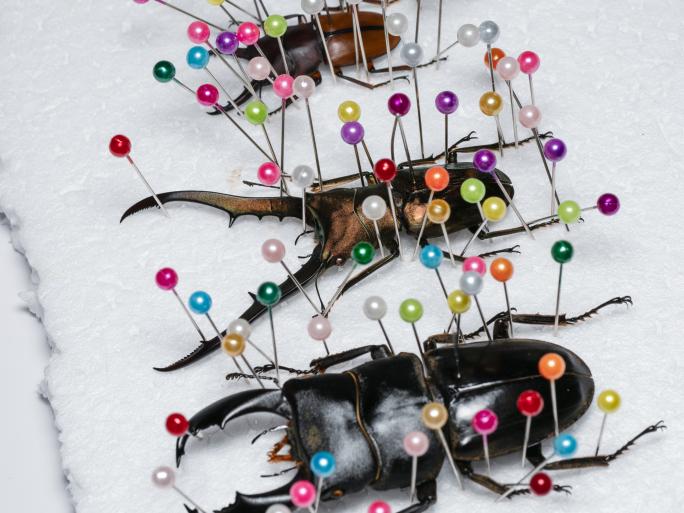発泡スチロールやコルクボードの上に昆虫を置き、標本針を使って体を固定します。標本針は昆虫のサイズに合わせて選び、カブトムシやクワガタの場合は右の上翅の上部あたりに刺します(正確な位置は図鑑やネットで確認すると良いでしょう)。