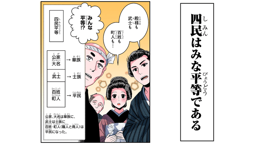 現在の日本では、すべての国民は法の下に平等…だが、かつてはそうではなかった! 明治に入って新政府が「四民平等」を打ち出し、さまざまな法令を出して、江戸時代までの厳しい身分制度がくずれたのだ。でも実際は完全に平等になった訳ではなく…!?