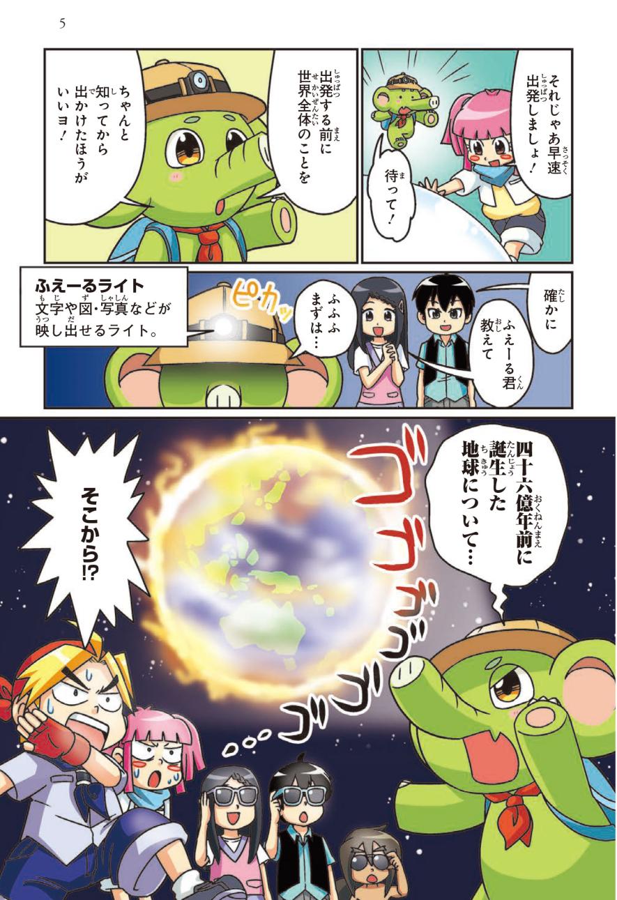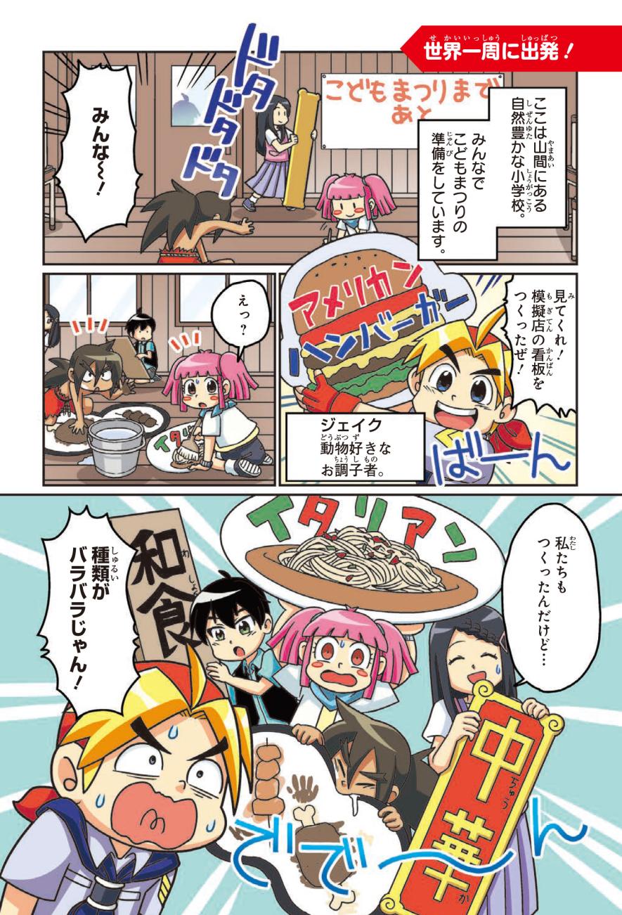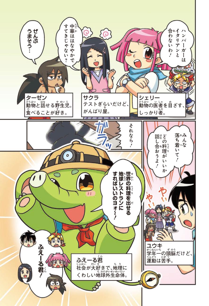 社会にくわしい地球外生命体のふえーる君とジェイクたちは「地球レストラン」を開くため、世界一周旅行に出発! ジェイクたちといっしょに、氷におおわれた国や砂漠が広がる国など、世界中をめぐって世界の地理博士になろう!