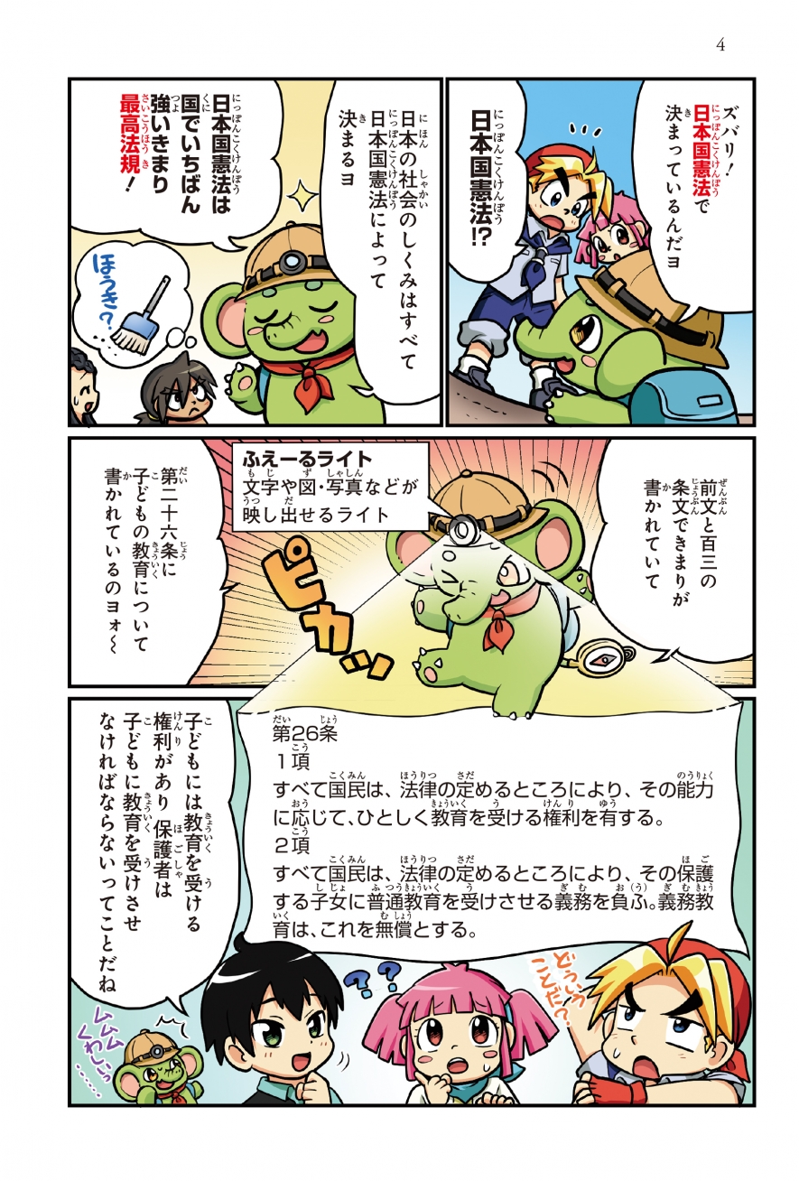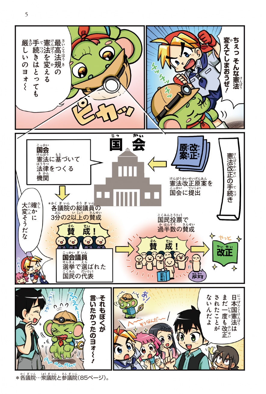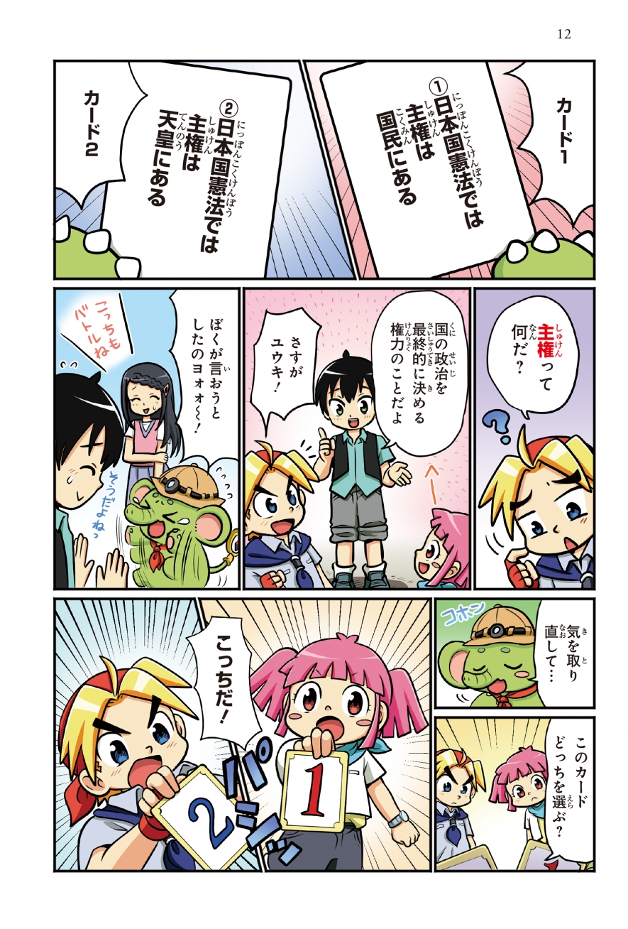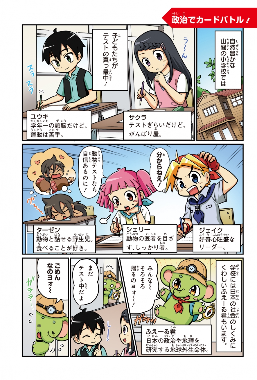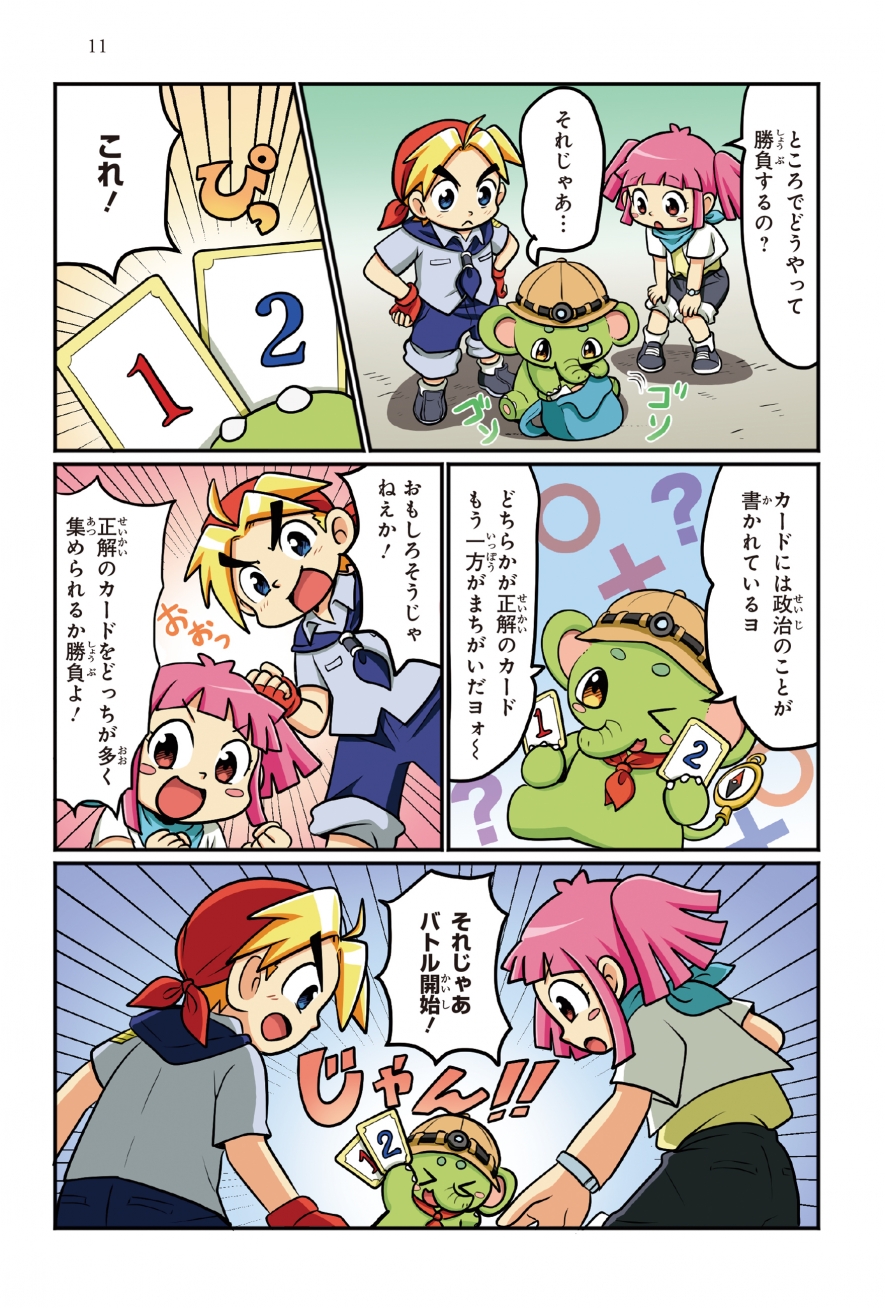 ジェイクとシェリーが政治についてのバトルカードで対決! ちょっぴり難しい政治の知識が楽しいまんがを読むだけでぐんぐん身につくよ。君もバトルに参加して政治のしくみを攻略しよう!