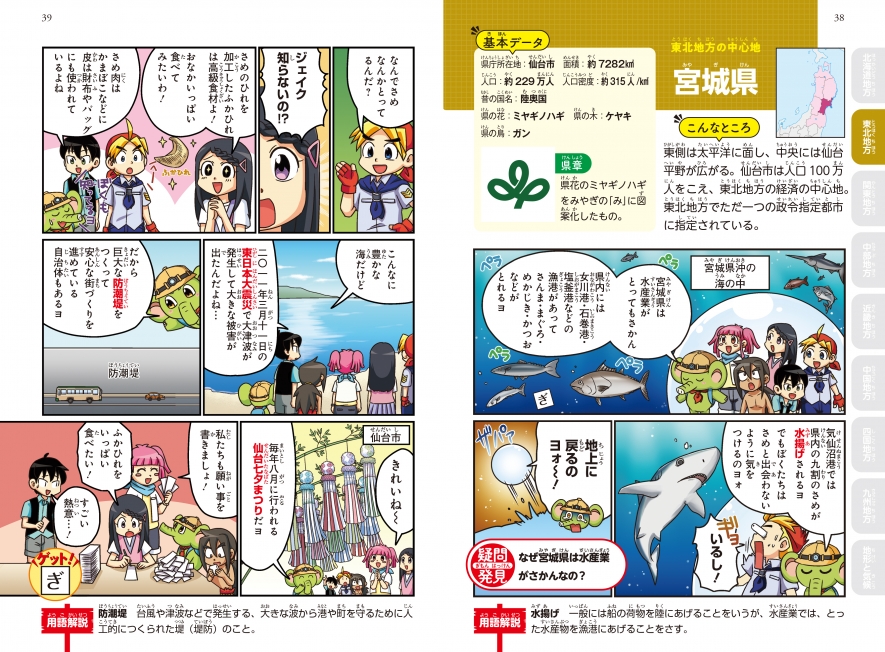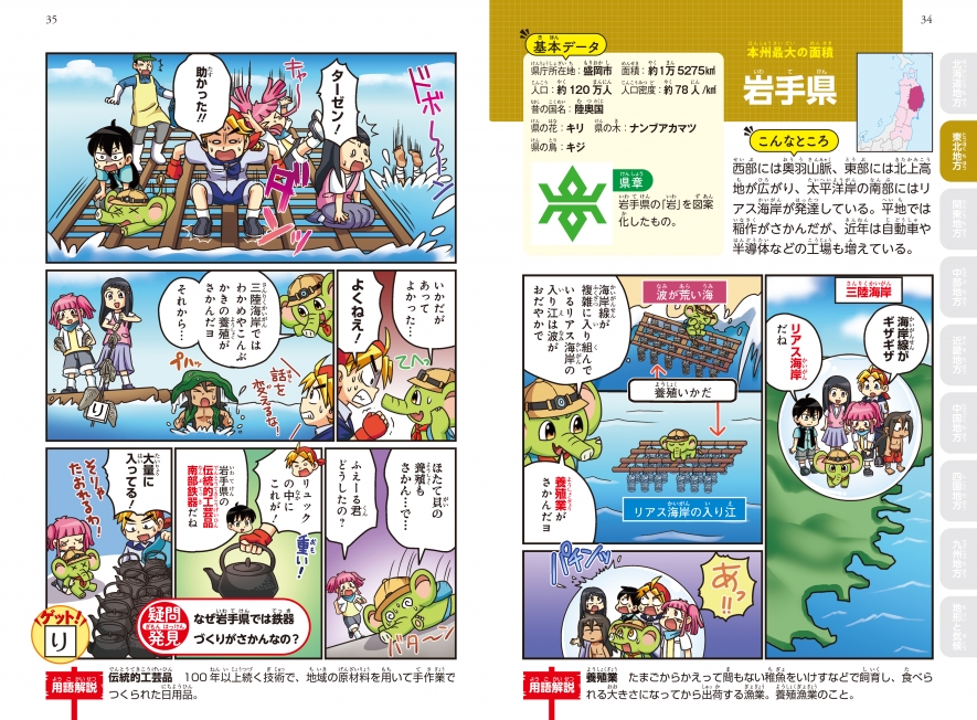 ジェイクたちは、ふえーる君が落としたメッセージピースをさがして、日本一周の旅に出発! ジェイクたちといっしょに47都道府県を旅して、各地の産業や自然・伝統文化などの知識をどんどんふやそう。目ざせ、地理博士!