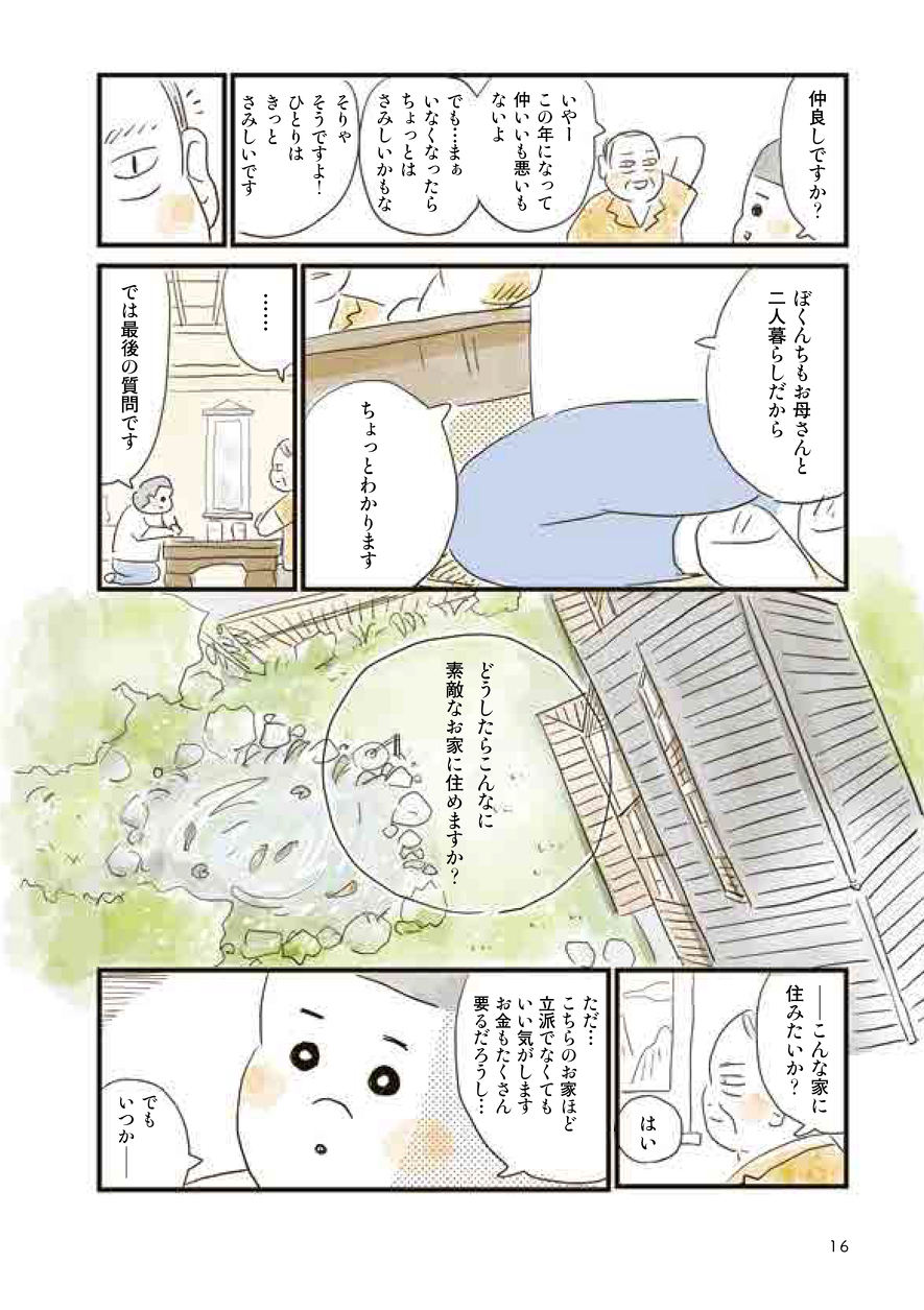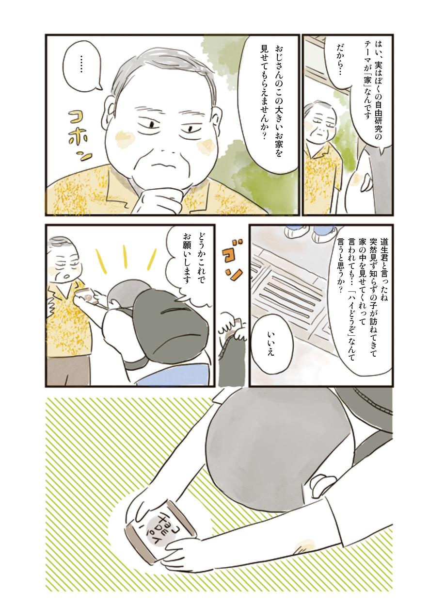 中はどうなっているんだろう? 住んでいる人はどんな人だろう? 家村道生は興味の赴くままに、気になる家の扉をたたきます。最初は渋々だった家主たちも、道生のまっすぐな思いに心を許し、家の中を案内していきます。学校で周囲になじめないという道生だけでなく、家主たちにも様々な事情があるようで——。