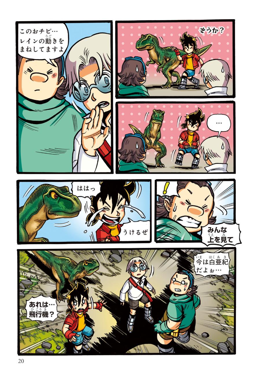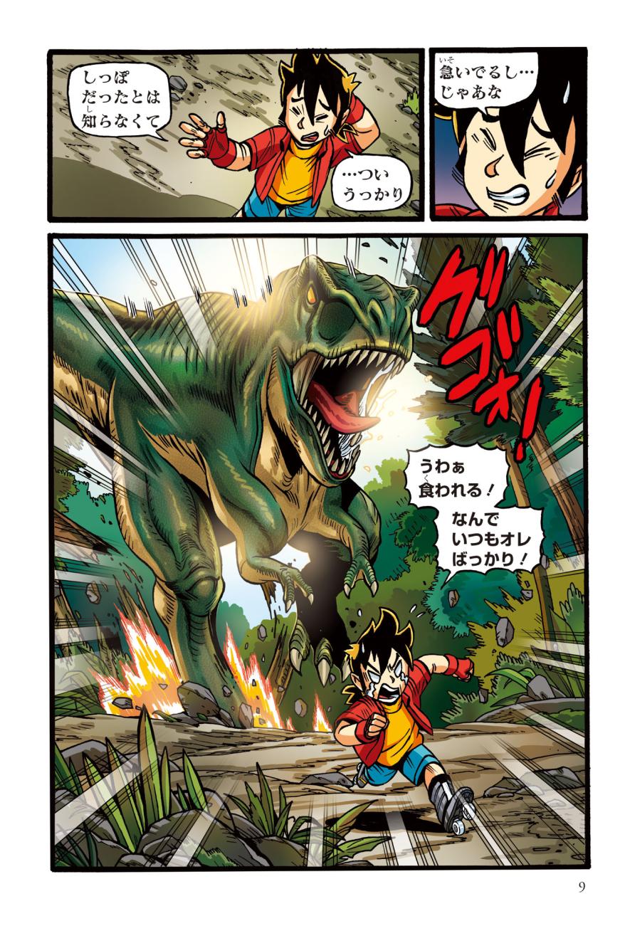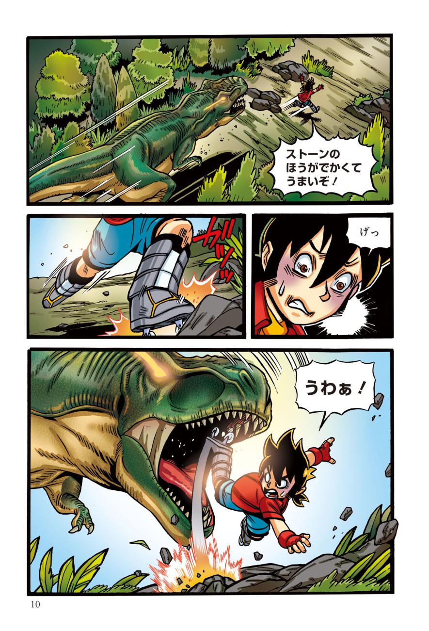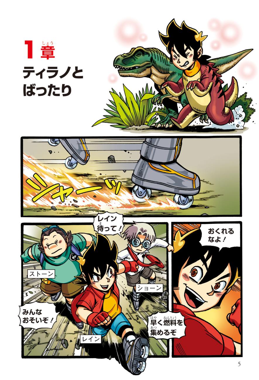 ひょんなことから太古の地球に来てしまった主人公のレインたちは、タイムマシンの燃料探しの途中に、ティラノサウルスとスピノサウルスのバトルにまき込まれてしまう…。さらに、トリケラトプスの群れのボス争いにも遭遇するなど大ピンチの連続で――!?