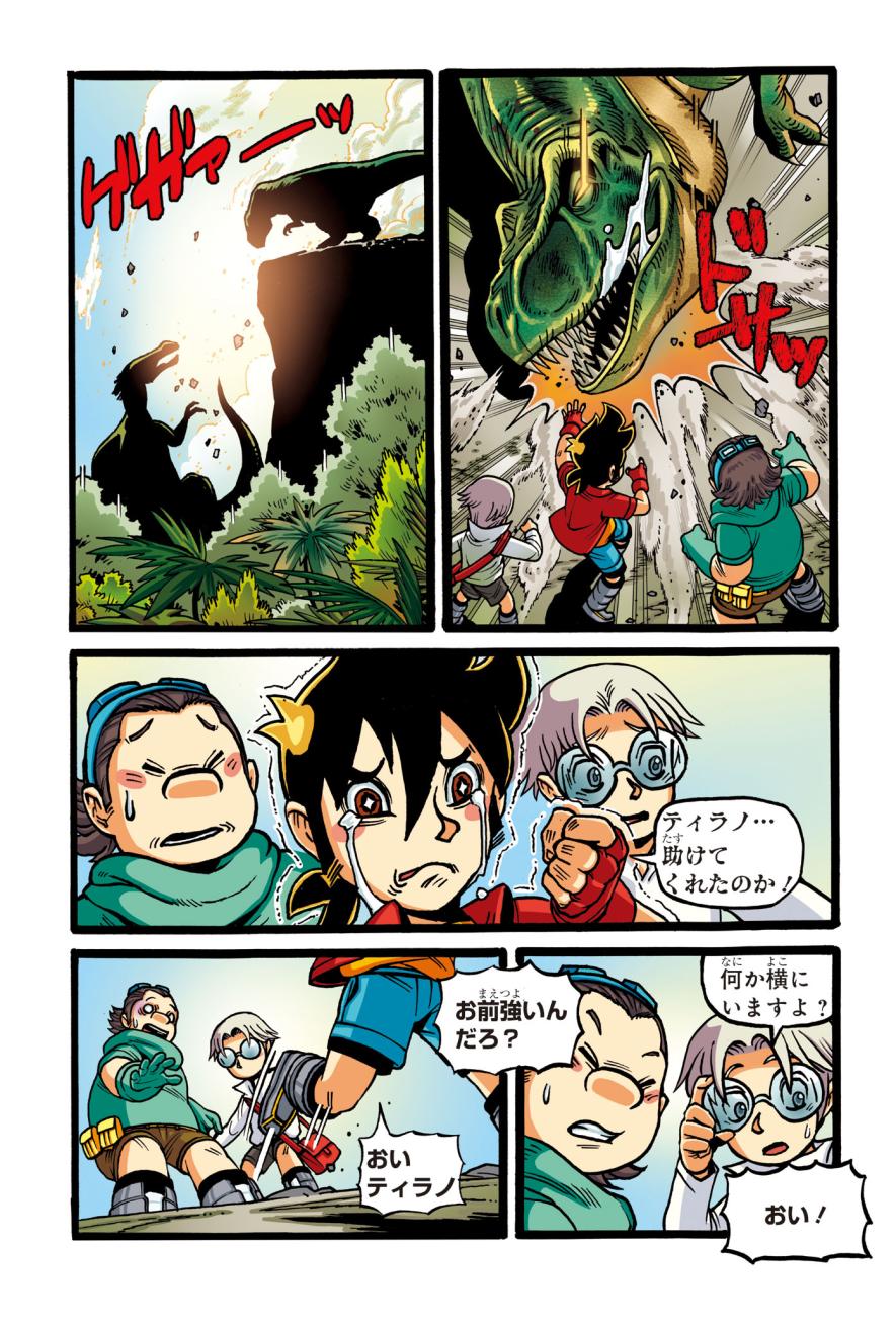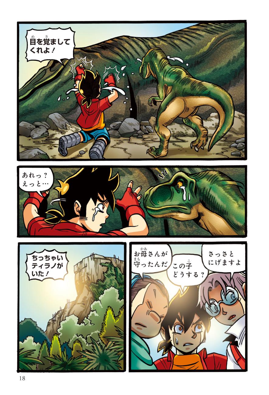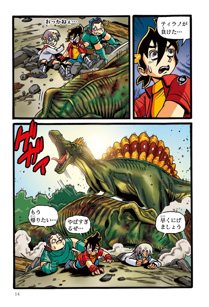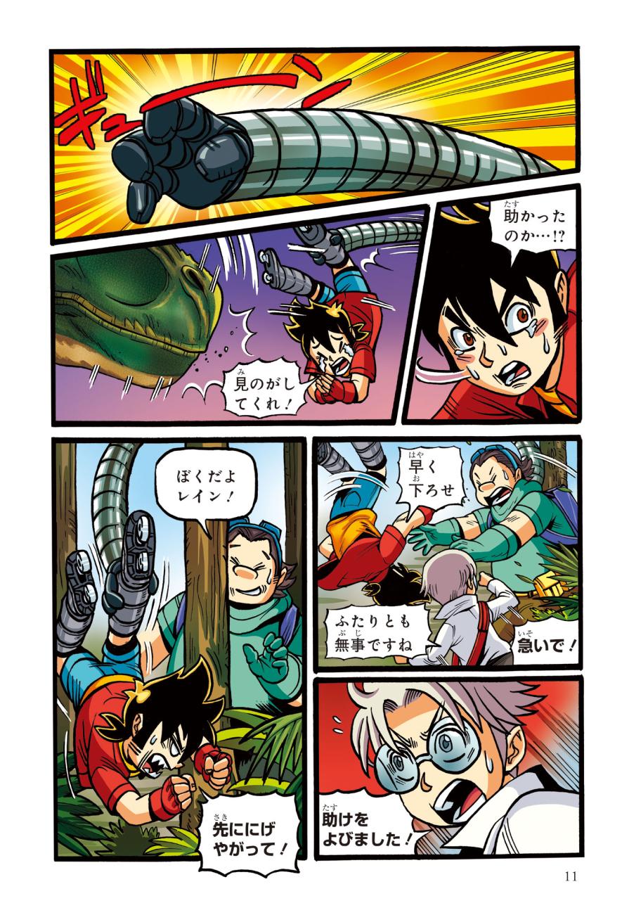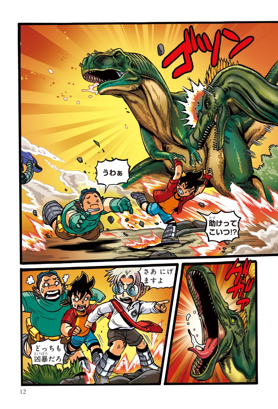 ひょんなことから太古の地球に来てしまった主人公のレインたちは、タイムマシンの燃料探しの途中に、ティラノサウルスとスピノサウルスのバトルにまき込まれてしまう…。さらに、トリケラトプスの群れのボス争いにも遭遇するなど大ピンチの連続で――!?