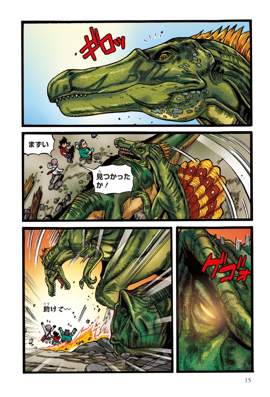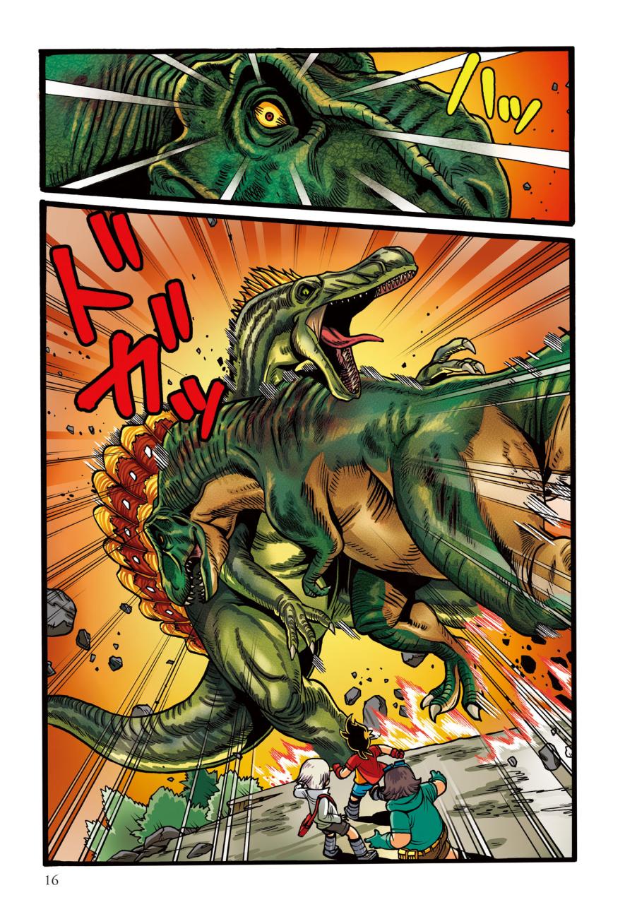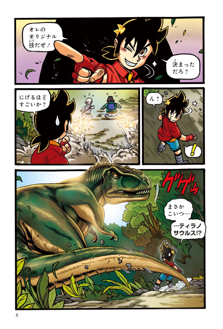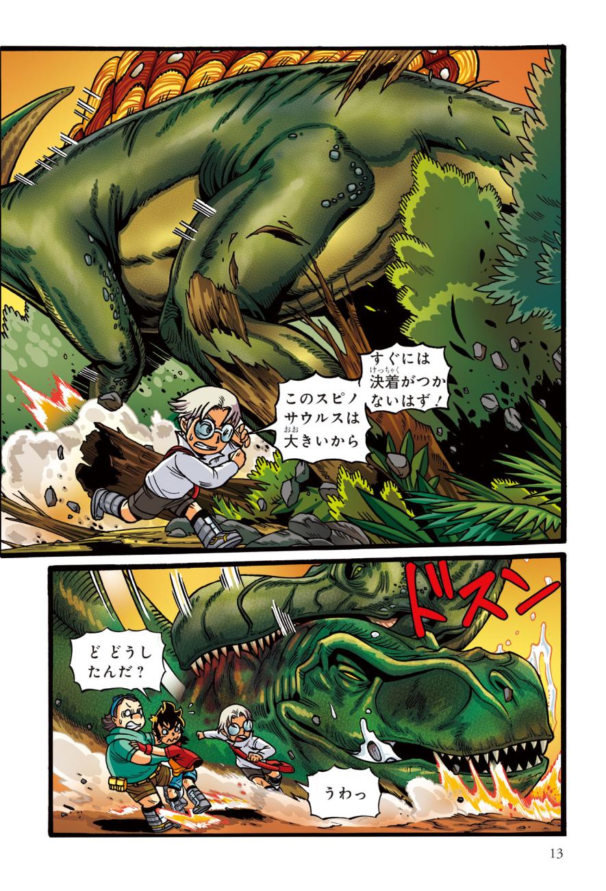 ひょんなことから太古の地球に来てしまった主人公のレインたちは、タイムマシンの燃料探しの途中に、ティラノサウルスとスピノサウルスのバトルにまき込まれてしまう…。さらに、トリケラトプスの群れのボス争いにも遭遇するなど大ピンチの連続で――!?