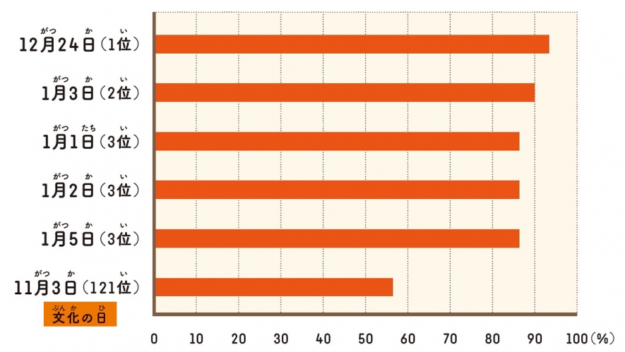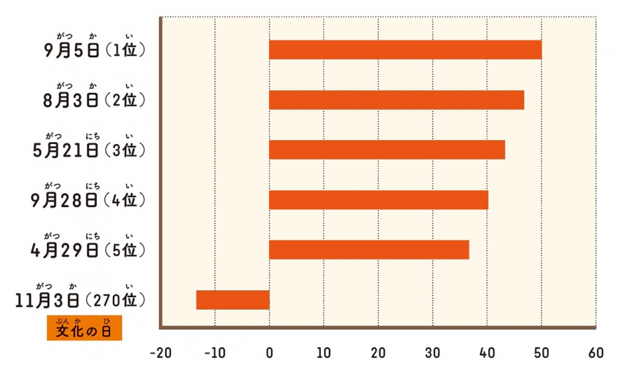 その結果、東京で最も晴れの特異日らしいのは9月5日で、文化の日は365日中270位と、全然特異日らしくありませんでした。晴れの出現率では文化の日は121位で、1位はクリスマス前日。上位がほぼ12〜2月なのは、西高東低の冬型の気圧配置になると太平洋側は空気が乾燥し、東京が晴れやすいことの表れです。