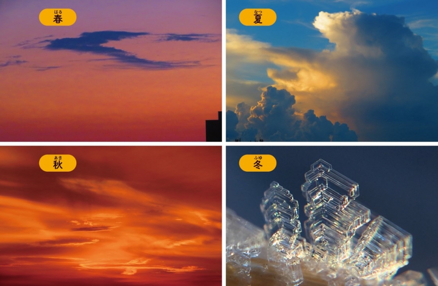まず、春は曙(日の出前の薄明の空)が素敵で、紫がかった雲が細くたなびいている様子を取り上げています。春で大気中のチリが多くレイリー散乱のよくきく薄明のとき、巻雲などがまだ焼けずに暗めの紫になっている状況と考えられます。夏は雨も趣があるということで、大気の状態が不安定で発達する積乱雲による雨が考えられます。雨の匂いも素敵ですよね。秋は夕暮れというのには同感で、高い空だけに雲が現れやすいので、盛大に焼ける条件も整いやすいです。そして冬は雪だけでなく早朝の霜も風情があるというあたり、清少納言はよくわかっています。