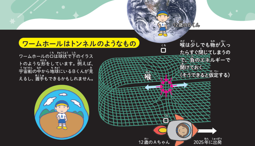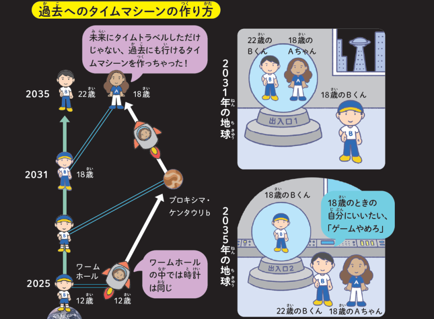 ワームホールの入り口の1つはびやあけ(B)くんと地球に置き、もう1つはあきみ(A)ちゃんが宇宙船に乗せて運び、P60と同じ方法で未来へタイムトラベルをします。18歳になったAちゃんが地球に戻ると、22歳になったBくんが出迎えてくれます。しかし、宇宙船の中のワームホールを覗くと18歳のBくんが見えます。ワームホールの中の時計は常に一致しているからです。4年前の地球にタイムトラベルできるポータルが完成しました。