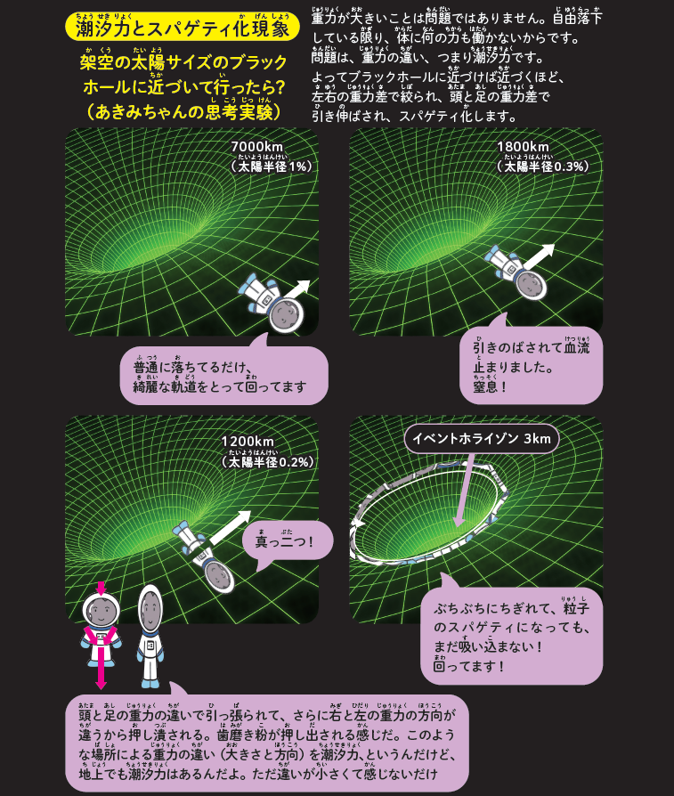 このブラックホールの周りを私が自由落下しながら少しずつ近づくと仮定します(宇宙服着用)。時空の歪みが大きくなっていくので、頭と足の場所の重力差から体が引っ張られ始めます。そしておよそ1200㎞まで近づくと、体は真っ二つに引き裂かれるでしょう。もっと近づけばもっと細かく引き裂かれますが、「私」はずっと回り続けます。このブラックホールの入り口、事象の地平線3㎞付近に近づかなければ吸い込まれることはないのです。