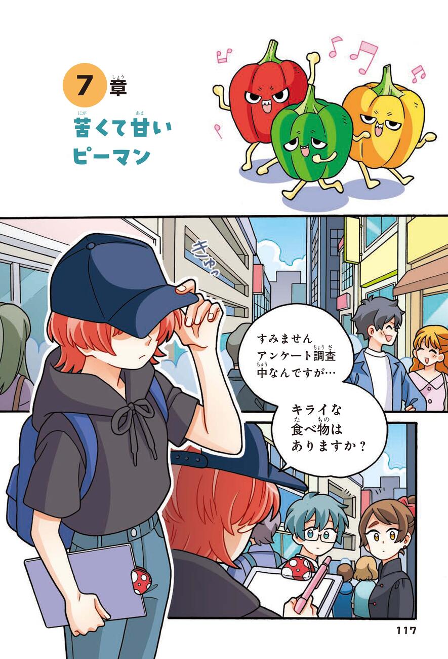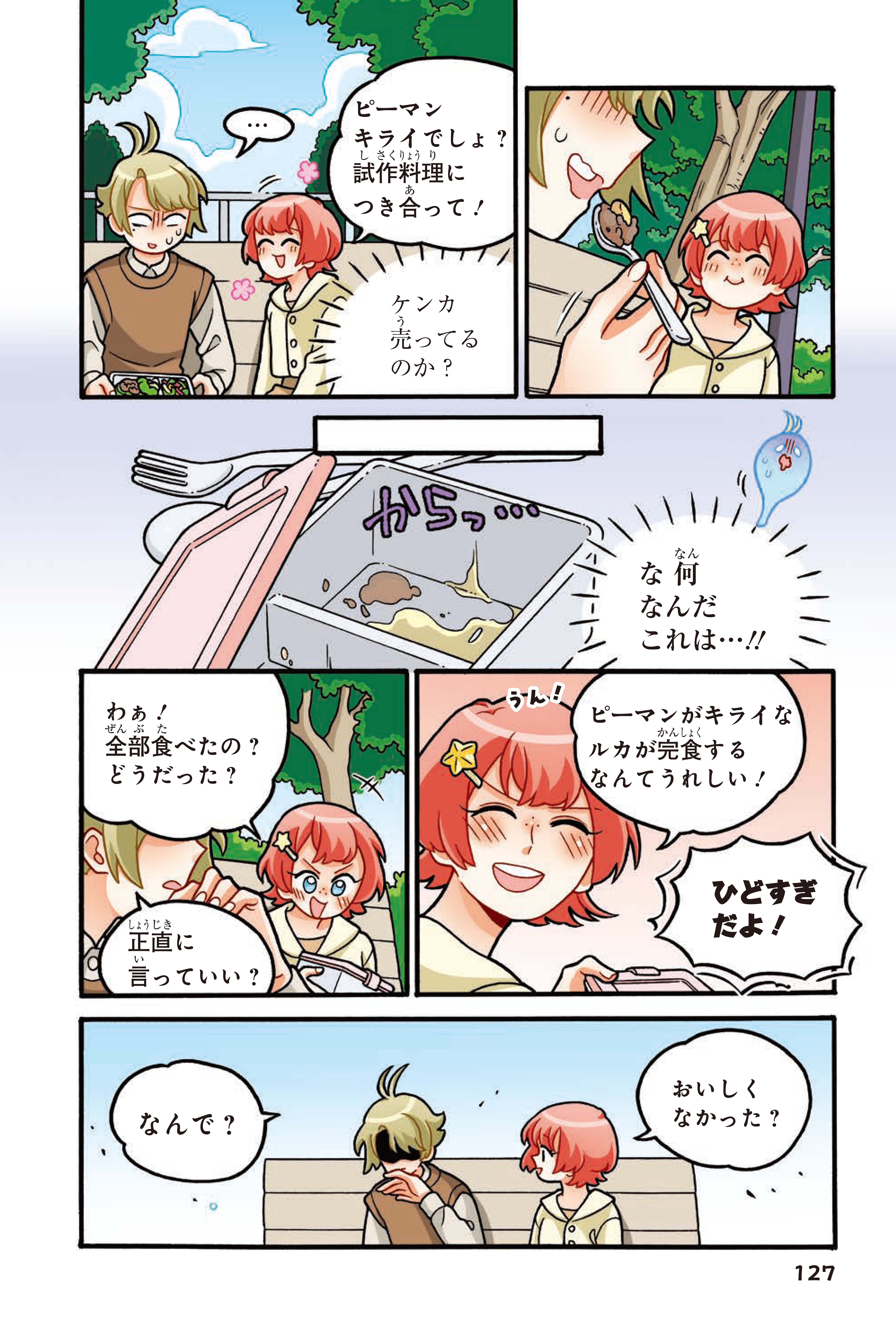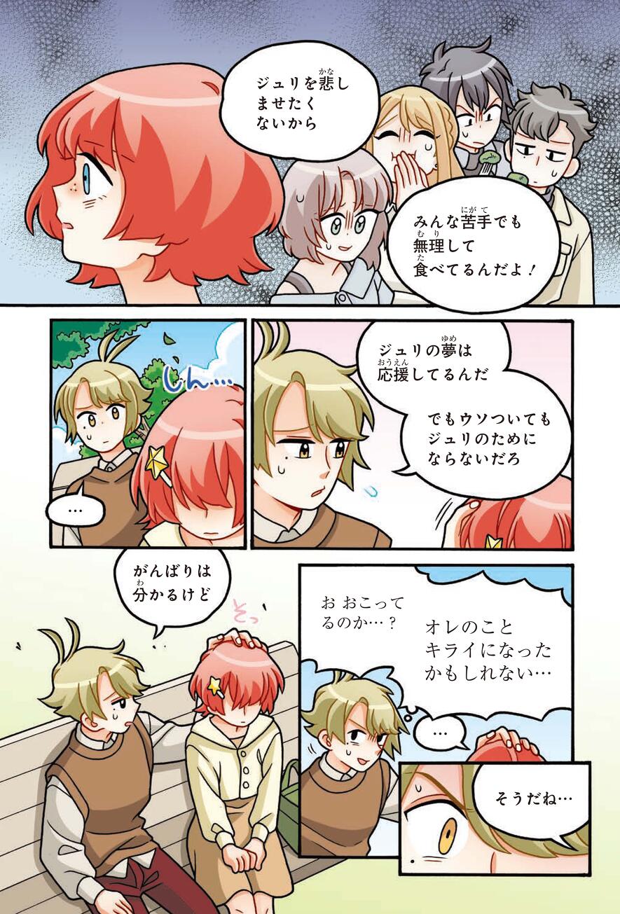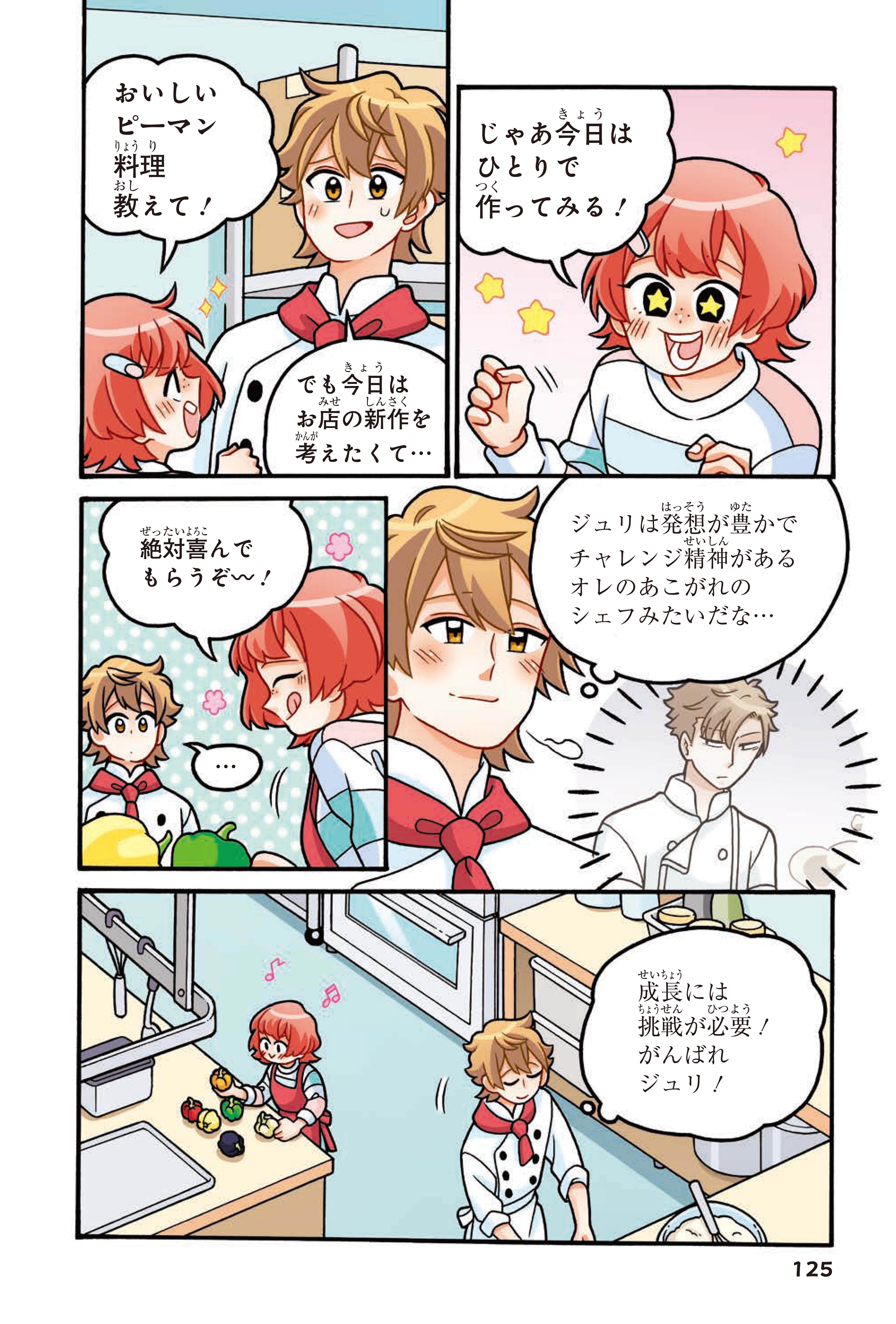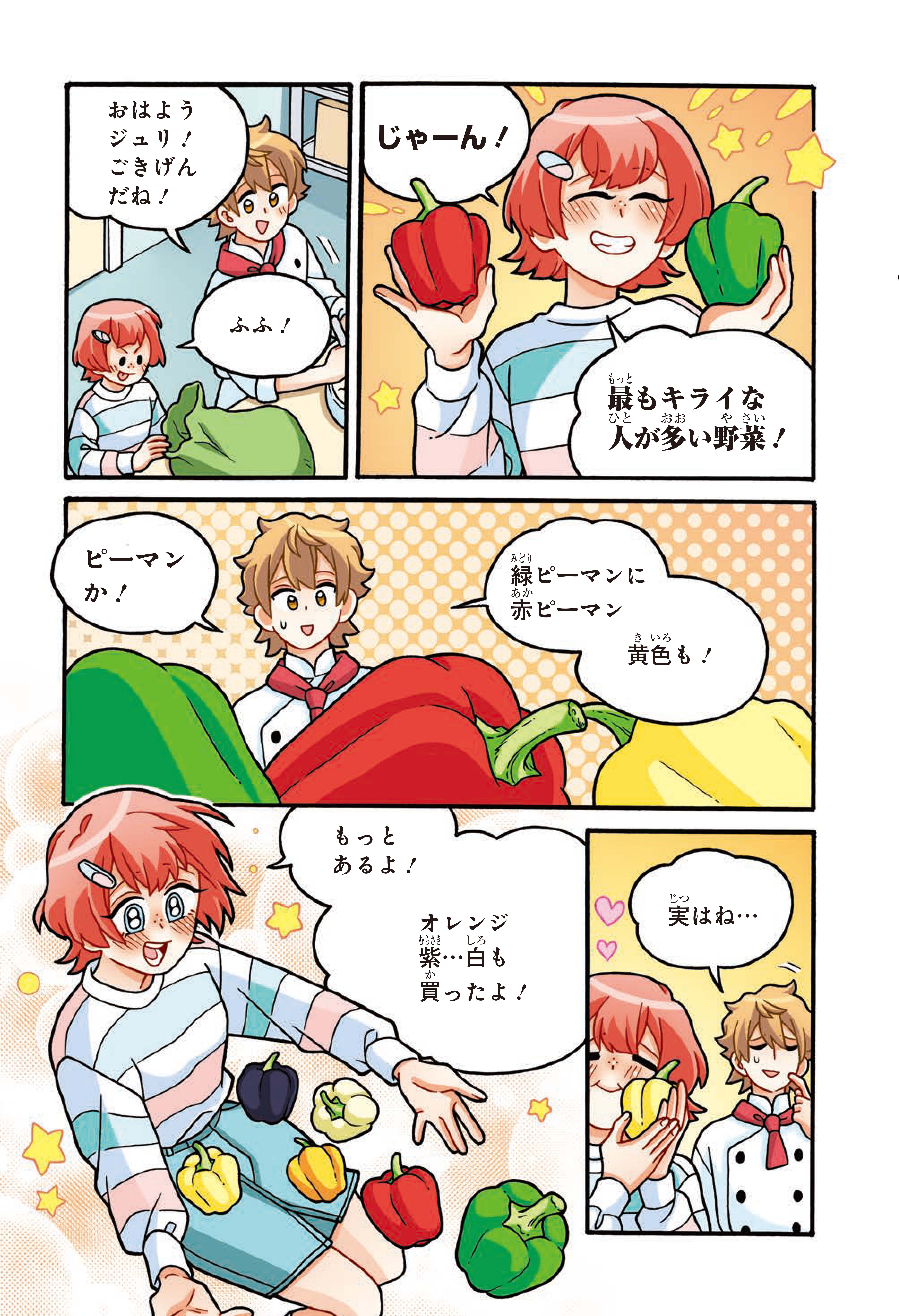 元気で前向きな女の子・ジュリは、「みんながキライなものでも、料理と栄養の力でおいしくしてみたい!」と思い、街で「いちばんキライな野菜」をアンケート調査することに。結果は「ピーマン」! 「ピーマンが苦いならあまくすればいいんじゃない!?」とひらめいて、ピーマンが苦手なイケメン男子・ルカのために料理を作ってみたら、予想外の反応が…?