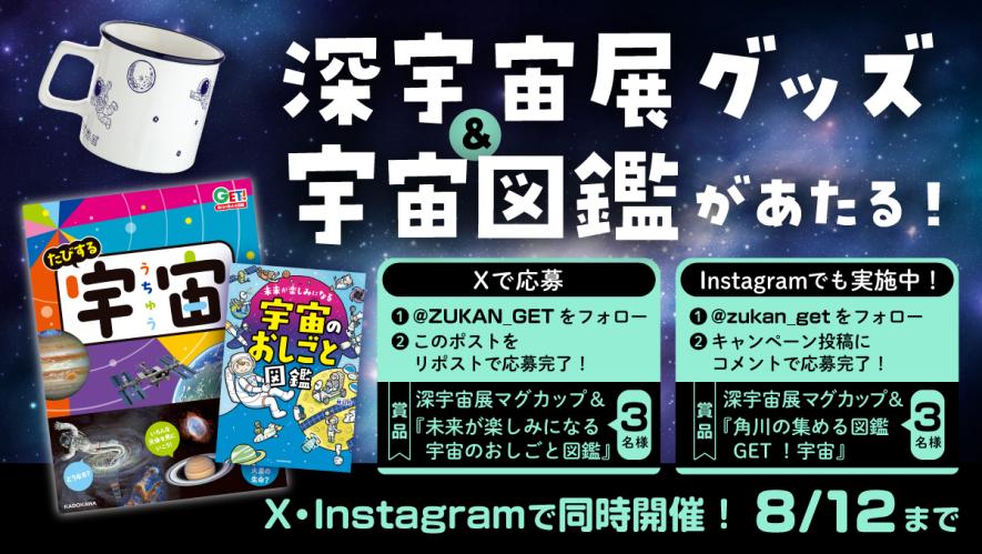 日本科学未来館で開催中の特別展「深宇宙展」のオリジナルグッズと『未来が楽しみになる宇宙のおしごと図鑑』または『角川の集める図鑑GET!宇宙』のセットが抽選で計6名様にあたるキャンペーンをXとInstagramで実施中!