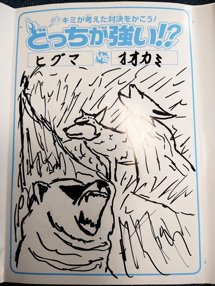 「えさを争うことがある」こともよく知っていますね! イラストから両者の雄たけびが聞こえてくるようです。