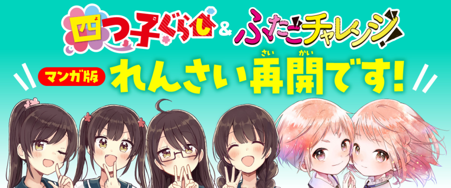大変おまたせしました!! システム障害のため公開できていなかったマンガ「四つ子ぐらし」と、マンガ「ふたごチャレンジ!」のれんさいを、本日から再開します!