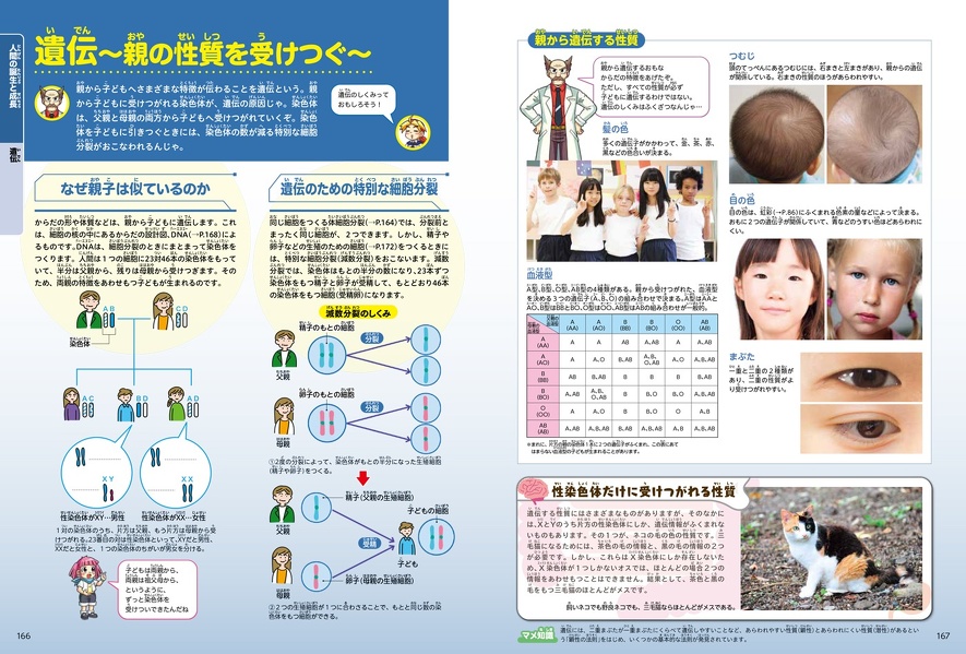 血液型のほかにも、髪の色や目の色、まぶたなど、親から遺伝する性質について知ることができます。ぜひ図鑑をチェックしてください。