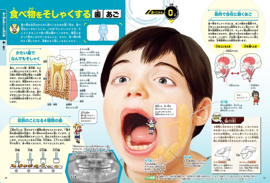 図鑑のなかでは、唾液腺がどこにあるか、唾液がどんな役割をもっているかなど、くわしく解説しています。