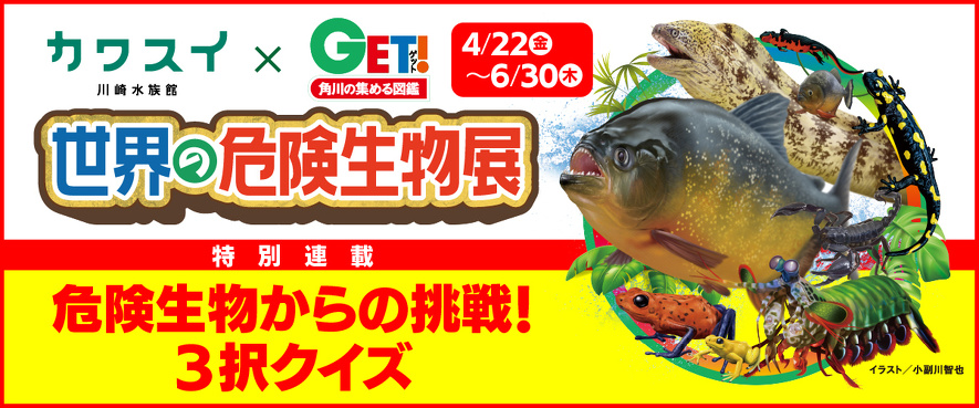 “カワスイ×「角川の集める図鑑GET!」世界の危険生物展”開催を記念して、本企画展や、カワスイ 川崎水族館内で展示されている危険生物のクイズをおおくりします!