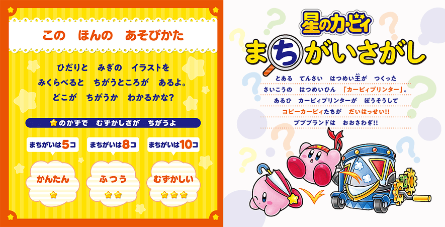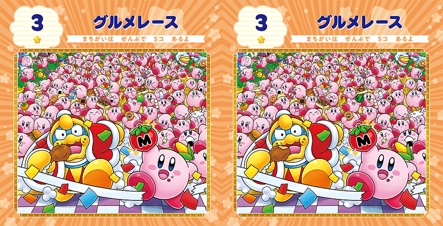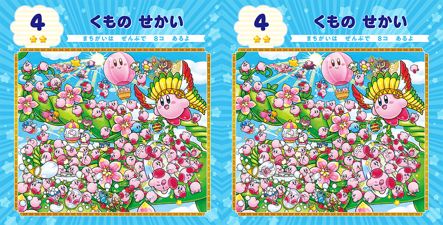 おもしろいのにむずかしい。カービィがいっぱい登場するまちがいさがしが登場! 「星のカービィをさがせ!!」のイラストがまちがいさがしになったよ♪ 星のカービィのイラストで楽しく脳トレしよう!