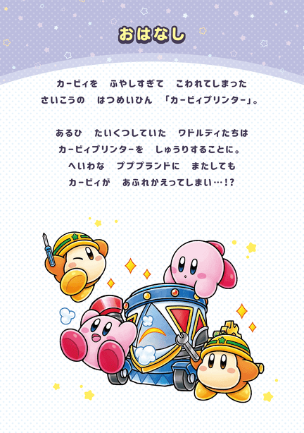 「カービィプリンター」がふたたび登場。またまたコピーカービィたちが大騒ぎ!? たくさんのカービィのなかから、いろんなカービィをさがそう!
