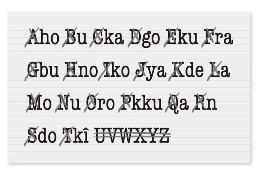 コーディは、赤ペンを使って、単語の最初の大文字にバツ印をつけていった。「Aho」から「A」を取ると「ho」に、「Bu」から「B」を取ると「u」に、「Cka」から「C」を取ると「ka」がのこる……というぐあいに、ぜんぶの頭の文字を消してしまってから、もう一度メモとにらめっこする。最後の単語──「UVWXYZ」というのが、ただのあまりだということは、わかっている。横に棒線を引いて、それを消し、のこった文字に目をやった。