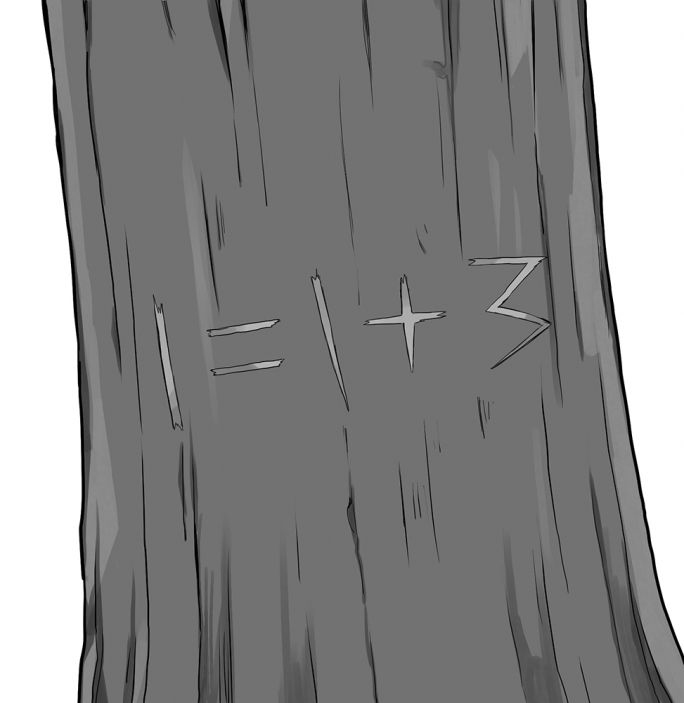 木の幹に、彫刻刀かなにかで、1=1+3と刻まれている。