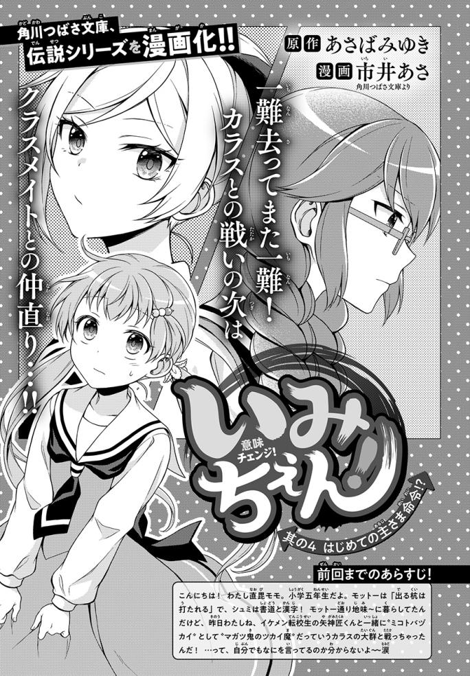 前の回 一覧へ ものがたり 2026.01.23 『いみちぇん!』コミカライズ 第4回 角川つばさ文庫 この記事をブックマークする 第5回へつづく(2026年3月24日公開予定) 角川つばさ文庫版 絶賛発売中! いみちぇん!(1) 今日からひみつの二人組 いみちぇん!(1) 今日からひみつの二人組 作: あさば みゆき 絵: 市井 あさ 【定価】 814円(本体740円+税) 【発売日】 2014年10月15日 【サイズ】 新書変形判 【ISBN】 9784046314307 ためし読み 紙の本を買う 電子書籍を買う あの人気シリーズが、大迫力のマンガで楽しめる! この記事をブックマークする 前の回 一覧へ この記事をシェアする