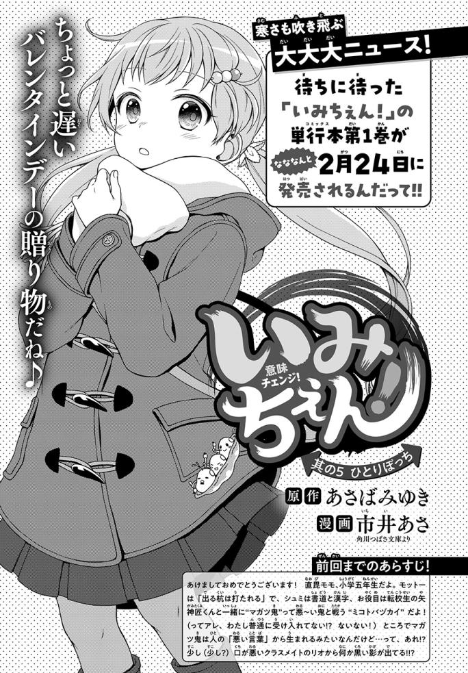 前の回 一覧へ NEW ものがたり 2026.03.24 『いみちぇん!』コミカライズ 第5回 角川つばさ文庫 この記事をブックマークする 第6回へつづく(2026年5月22日公開予定) <サイン色紙が抽選であたる!>あすかコミックスDX「いみちぇん!①」と角川つばさBOOKS「いみちぇん!!廻④」を買って応募しよう! 角川つばさ文庫版 絶賛発売中! いみちぇん!(1) 今日からひみつの二人組 いみちぇん!(1) 今日からひみつの二人組 作: あさば みゆき 絵: 市井 あさ 【定価】 858円(本体780円+税) 【発売日】 2014年10月15日 【サイズ】 新書変形判 【ISBN】 9784046314307 ためし読み 紙の本を買う 電子書籍を買う あの人気シリーズが、大迫力のマンガで楽しめる! この記事をブックマークする 前の回 一覧へ この記事をシェアする コピーしました!