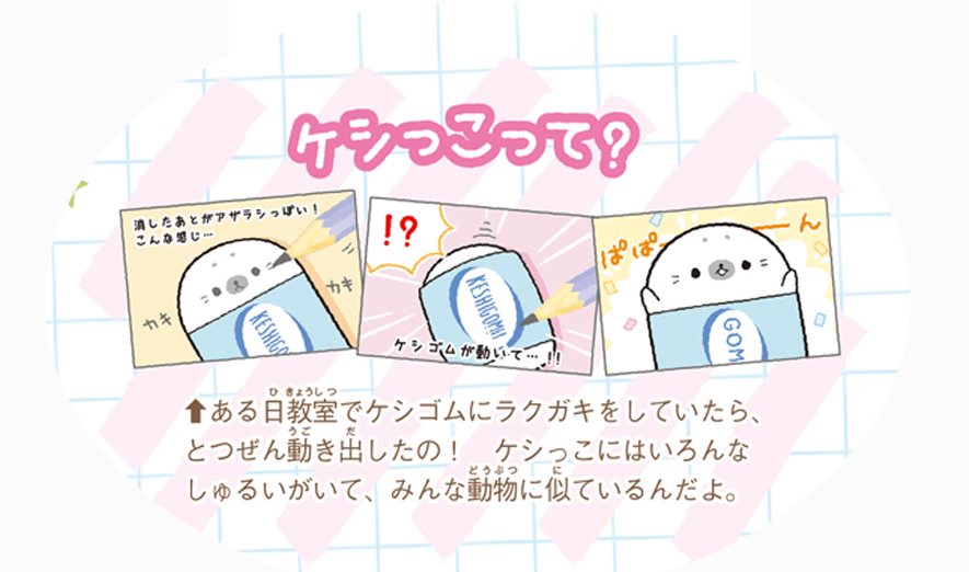 一覧へ 次の回 ものがたり 2022.10.25 『ケシっこ』4コママンガ 第1回 ケシっこのヒミツを大しょーかい☆ キャラぱふぇ この記事をブックマークする 女の子のためのキャラクター&ゲームざっし『キャラぱふぇ』で掲載していた「ケシっこ」の4コママンガがヨメルバにやってきた! ゴマアザラシのケシっこ・ケシゴマやネコのケシっこ・ケシネコたちが登場するよ♪ ケシっこ キャラクター紹介! クイズの答えと4コママンガは次のページへ…▶ 1 2 この記事をブックマークする 一覧へ 次の回 この記事をシェアする