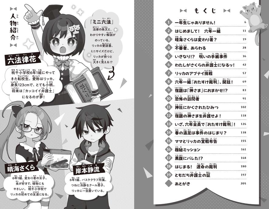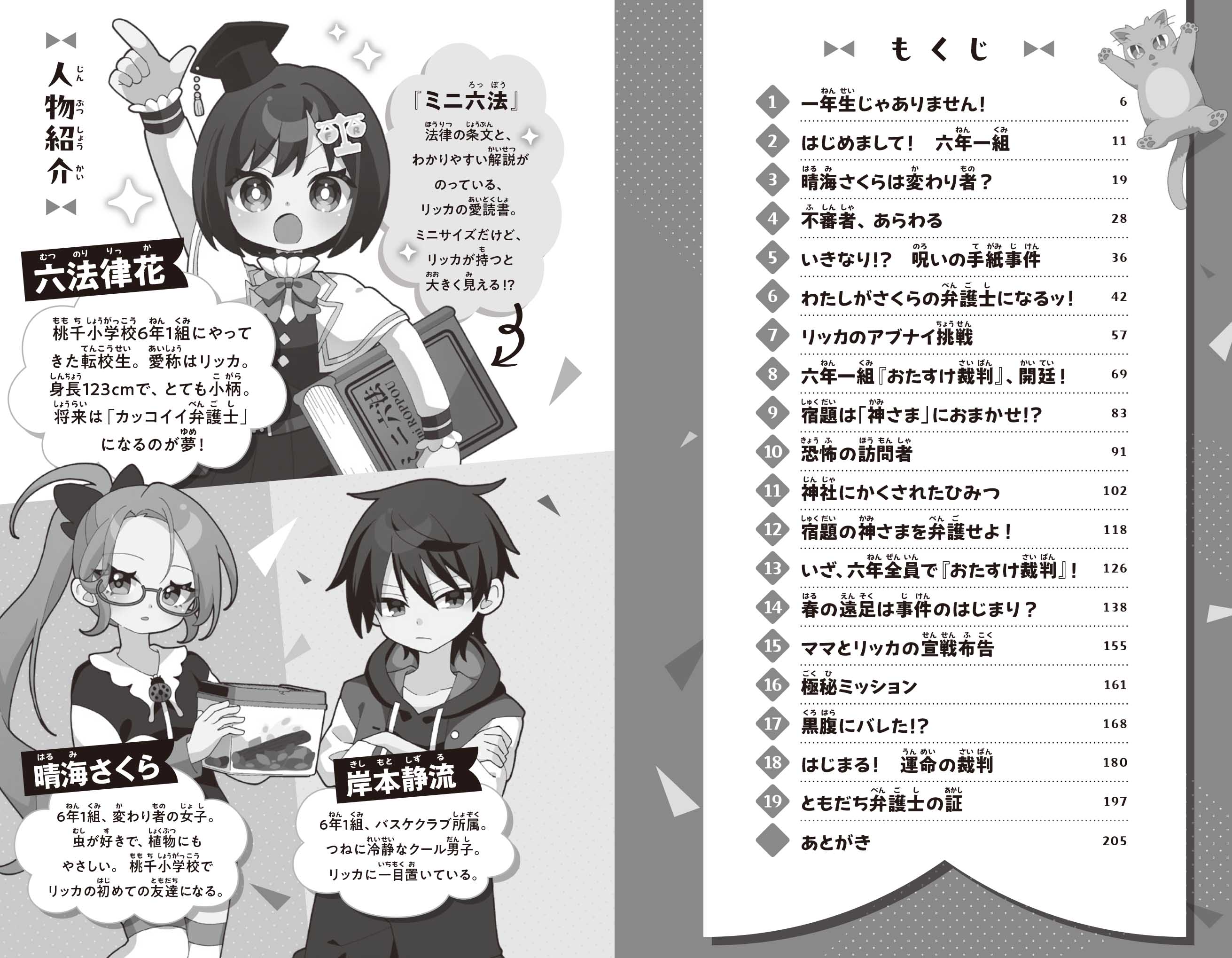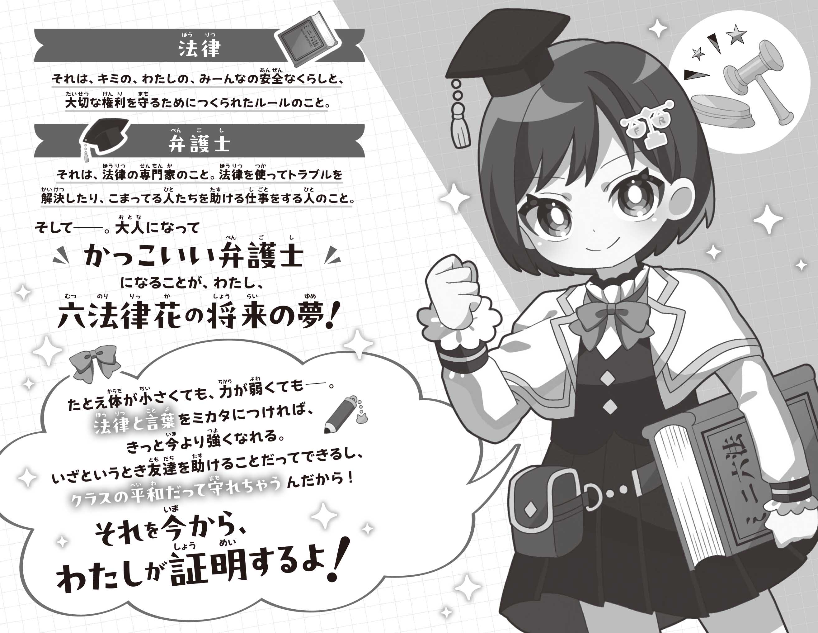 わたし、六法律花の夢はカッコイイ弁護士になることっ! 1年生にまちがえられちゃう「おちび」な6年生だけど、ナカミには法律とあきらめないココロがつまってる。転校した学校でおこる事件だって、絶対見のがさない! 「呪いの手紙事件」に、「宿題の神様事件」。犯人だと疑われてる子たち、ホントにそうなのか!? モヤモヤしているのにだまっているのは、もうイヤなんだ。真相をあきらかにするため、やろうよ、「おたすけ裁判」! もちろんわたしが、こまってる子の弁護士になるから――!