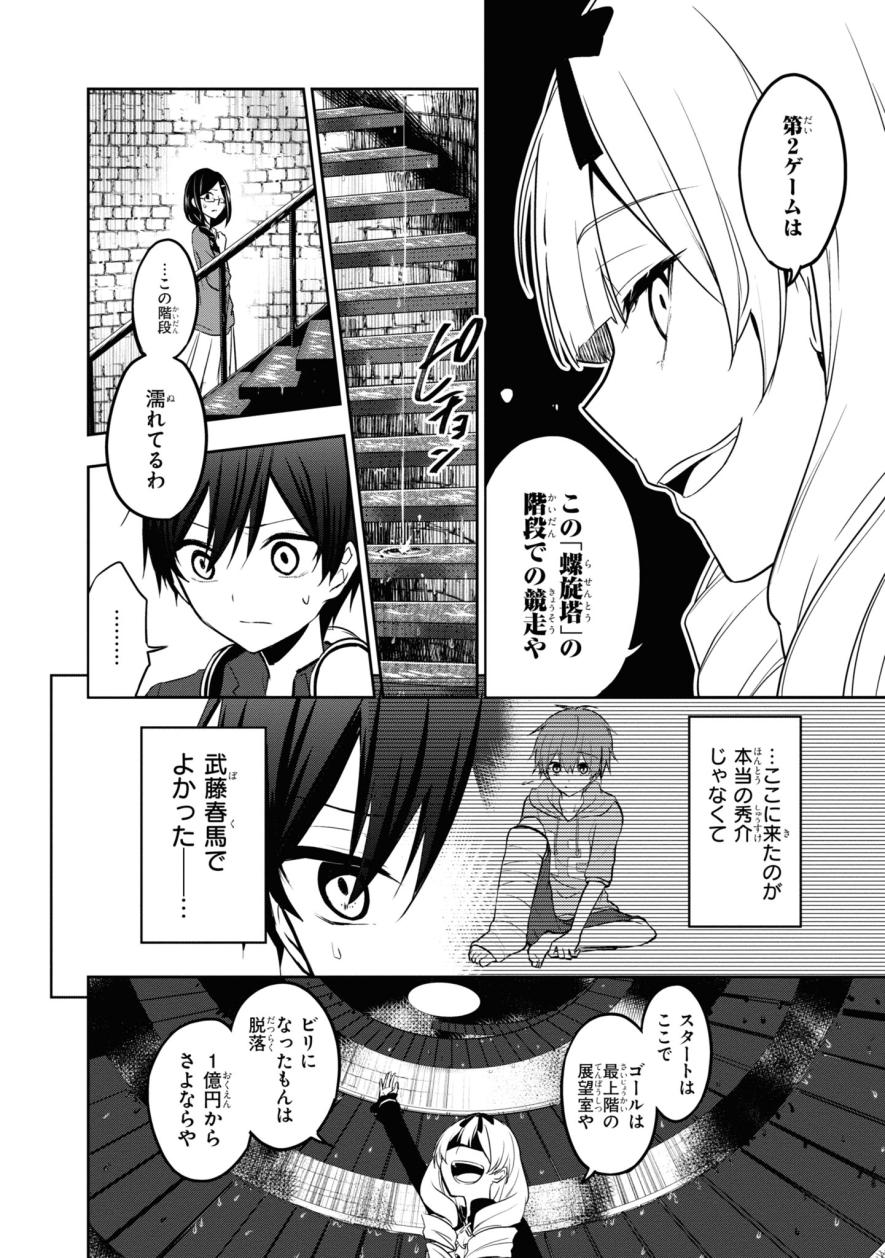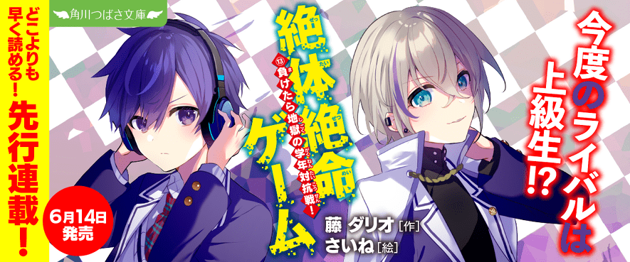前の回 一覧へ 次の回 ものがたり 2025.11.14 絶体絶命ゲーム 第3話 螺旋塔の戦い 角川つばさ文庫 この記事をブックマークする 第4話につづく コミック1~2巻 絶賛発売中! 絶体絶命ゲーム 1 絶体絶命ゲーム 1 漫画:佐藤 まひろ 原作:藤 ダリオ キャラクター原案:さいね 【定価】 693円(本体630円+税) 【発売日】 2021年03月27日 【サイズ】 B6判 【ISBN】 9784046802743 ためし読み 紙の本を買う 電子書籍を買う 絶体絶命ゲーム 2 絶体絶命ゲーム 2 漫画:佐藤 まひろ 原作:藤 ダリオ キャラクター原案:さいね 【定価】 704円(本体640円+税) 【発売日】 2021年10月27日 【サイズ】 B6判 【ISBN】 9784046807175 ためし読み 紙の本を買う 電子書籍を買う つばさ文庫版 絶賛発売中! 絶体絶命ゲーム 1億円争奪サバイバル 絶体絶命ゲーム 1億円争奪サバイバル 作:藤 ダリオ 絵:さいね 【定価】 本体680円(税別) 【発売日】 2017年2月15日 【サイズ】 新書判 【ISBN】 9784046316813 ためし読み 紙の本を買う 電子書籍を買う 1 2 この記事をブックマークする 前の回 一覧へ 次の回 この記事をシェアする