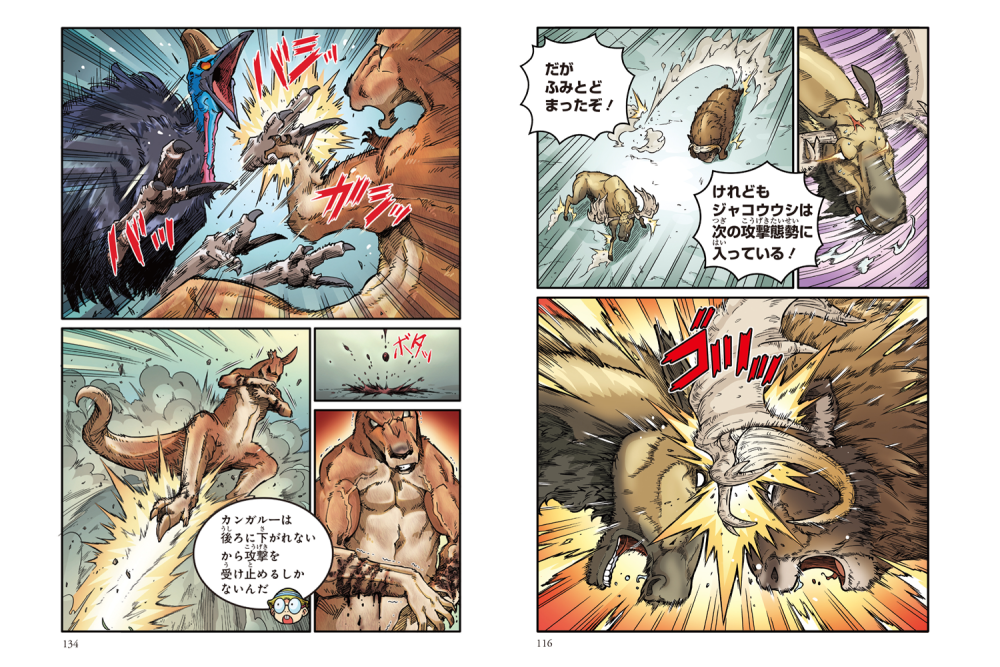 特長その ド迫力の動物バトルで、科学に目覚める!「どっちが強い!?」シリーズは、「ライオンとトラが戦ったらどっちが強いの?」といった子どもたちの素朴な疑問に応える科学まんがです。動物たちのド迫力バトルを通して、生態や特徴を楽しく学ぶことができます。「ライオンの噛む力はどれくらい?」「高い所からの急降下攻撃と、地上からの攻撃ではどちらがダメージが大きい?」そんな科学的な視点からの検証や解説も盛り込まれているので、ストーリーを楽しみながら、科学的思考や想像力が自然と育まれていきます。
