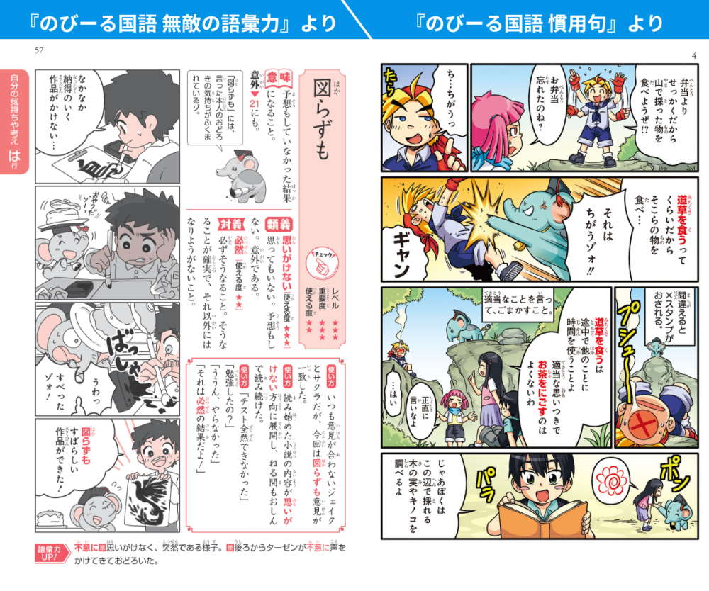 特長その 学校の学習内容をくまなくカバー子どもたちが夢中になる楽しいまんがでありながら、学校の授業で学習する内容をしっかりカバーしているのが「のびーる」シリーズの大きな特長です。そのため、小学生のうちに身につけておきたい学習内容を、無理なく習得することができます。得意教科のさらなるレベルアップはもちろん、苦手科目の克服にも効果的です。