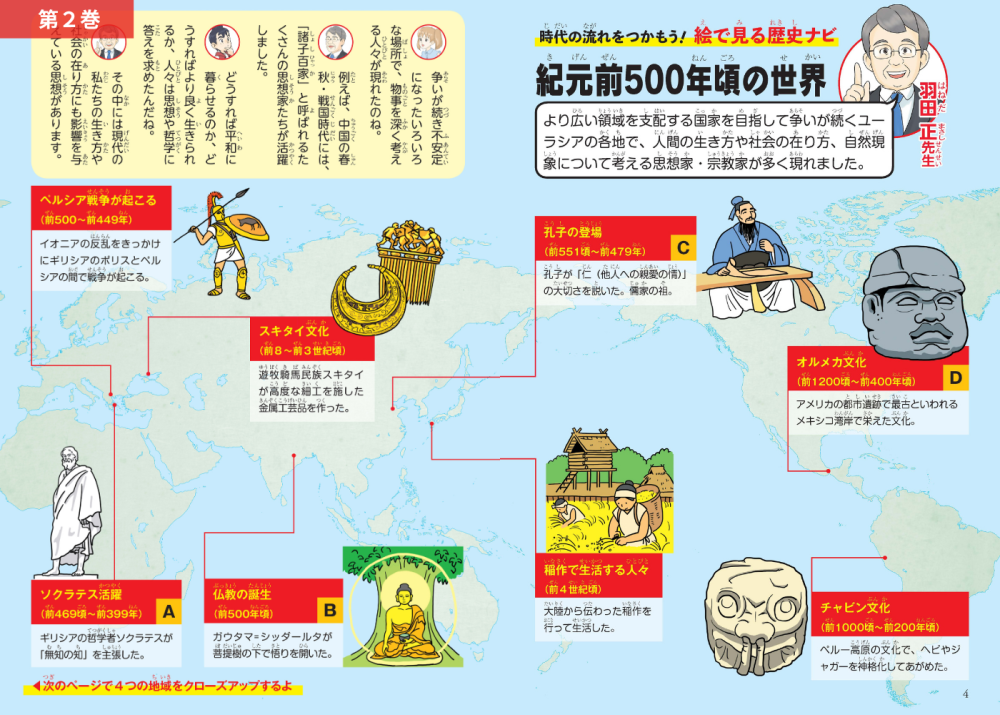 各巻で、同じ時代に世界の各地で何が起きていたのかを横断的に描いており、自然と“横のつながり”を理解できる構成になっています。さらに時代の流れがひと目でわかる「絵で見る歴史ナビ」や、時代の代表的な人物たちが楽しく時代背景を紹介する「もしもまんが」など、横の歴史を理解する工夫が満載です。