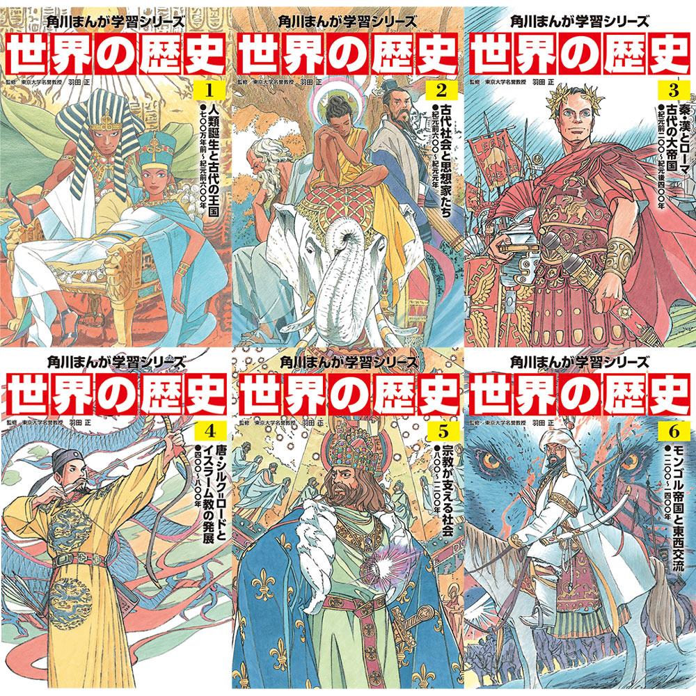 この角川まんが学習シリーズ『世界の歴史』は、人類の誕生から現代までの世界の歩みを20巻に分け、各巻ごとに、「縦の世界史」と「横の世界史」を組み合わせた一枚の織物の図柄が浮かび上がるように工夫しました。これはこれからの歴史学習の方向性を先取りした新しい試みです。現代を生きる皆さんには、世界という枠組みでものを考え、行動することが求められています。このシリーズで学ぶ世界史は決して外国の歴史の寄せ集めではありません。それは「つながる世界」という未来への扉を開く鍵となる、皆さん自身の歴史なのです。