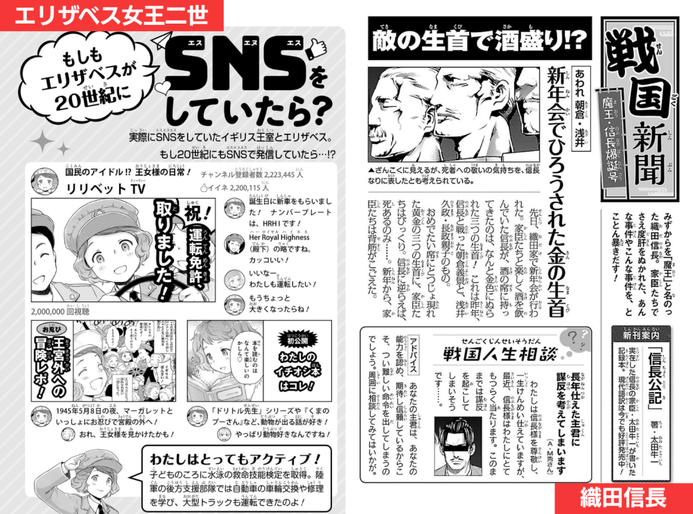 特長その 遊び心いっぱいの学習ページ!巻末には偉人たちのおもしろエピソードやクイズ、もしも偉人たちがSNSを使っていたら…など、子どもたちの好奇心をくすぐる楽しいページを収録。偉人たちや歴史についてもっと知りたくなる・調べたくなるように構成されています。