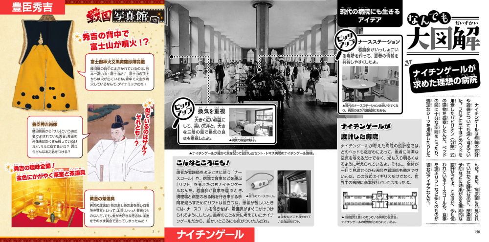 特長その わかりやすいビジュアル資料も満載!偉人たちに関連する写真や図解のビジュアル資料も多数収録しています。偉人たちが生きた時代背景をわかりやすくつかむことができるので、まんがをより楽しく読むことができます。人物が生きた時代を、まんがとビジュアル資料でふれるうちに、自然と歴史への興味が育まれていきます。