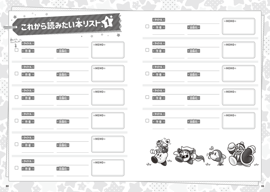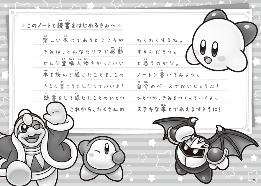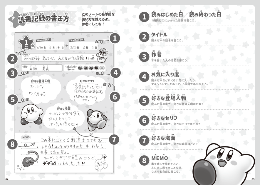 『星のカービィ 読書ノート』は、大人気キャラクターのカービィとその仲間たちがたくさん登場するノートで、読んだ本の題名や感想を、楽しみながら書き込めるノートです。読書の思い出を楽しく記録してみてはいかがですか☆