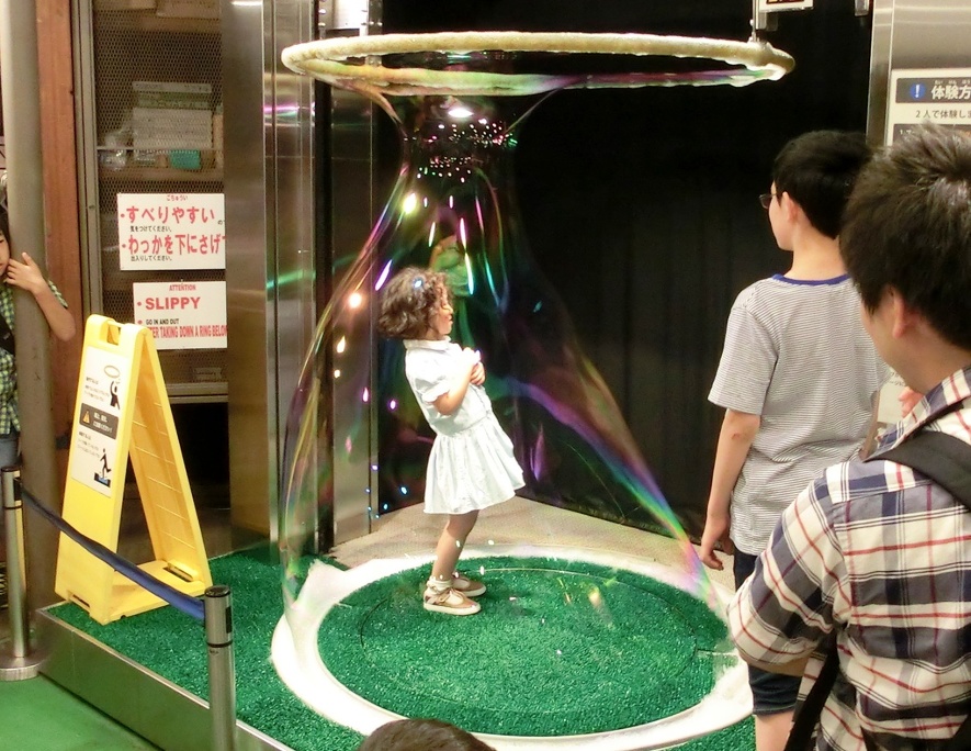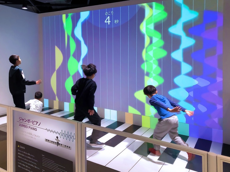 展示室は2~5階の4フロアに広がり、約20種のテーマコンテンツを用意。「でっかいシャボン玉」では、なんと大きなしゃぼん玉に体がすっぽり入る体験ができます! 「ジャンボ・ピアノ」は、特大の鍵盤を踏むと音が出るとともに、それに応じた色や形、大きさの異なる波が現れ、キッズたちは体を使ってエンジョイ。車好きな子に人気なのが、ドライビングシミュレーターを体験しながら、エコについて学べる「タウンドライビング」です。