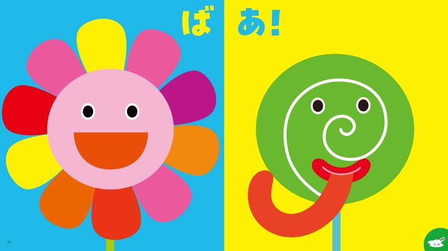 「ばあ!」は、赤ちゃんに大人気の"いないいないばあ"遊びをモチーフにしました。赤ちゃんは比較的早い時期から、目の前から物が隠れて見えなくなっても「そこに何かがあるはず」と予測して期待すると言われています。これが、"いないいないばあ"遊びを0歳の赤ちゃんが楽しめる理由です。そうした発達特性をベースにしつつ、お花やぺろぺろキャンディーに目と口を加えるなどして、「顔っぽい」刺激も意識しました。